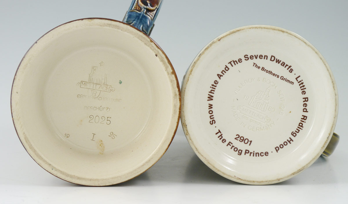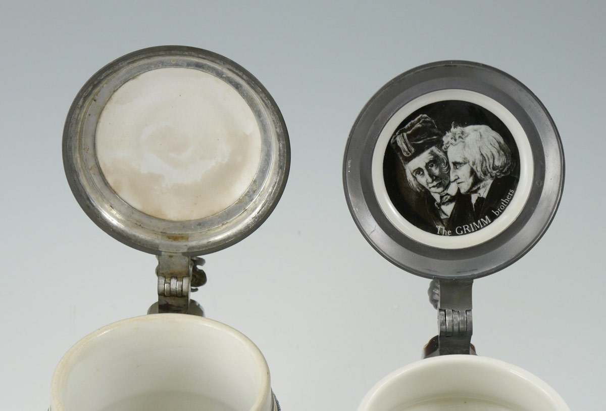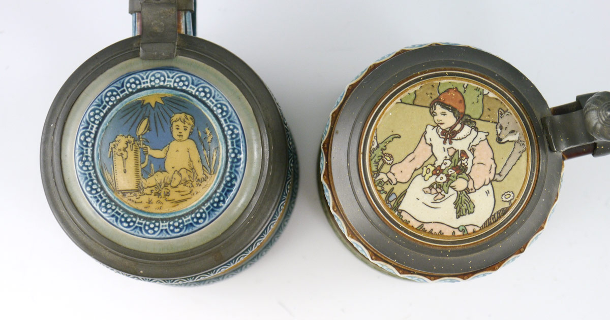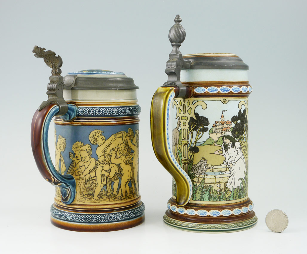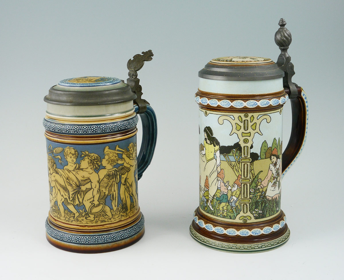2 METTLACH STEINS 2025 & 2091: To include 1) #2025 incised with cherubs, 1/2 liter, hinged lid with inset plaque. 7 3/4'' h. x 6''. 2) #2091 ''The Brothers Grimm'' fairy tale motifs. 9'' h. x 6''.