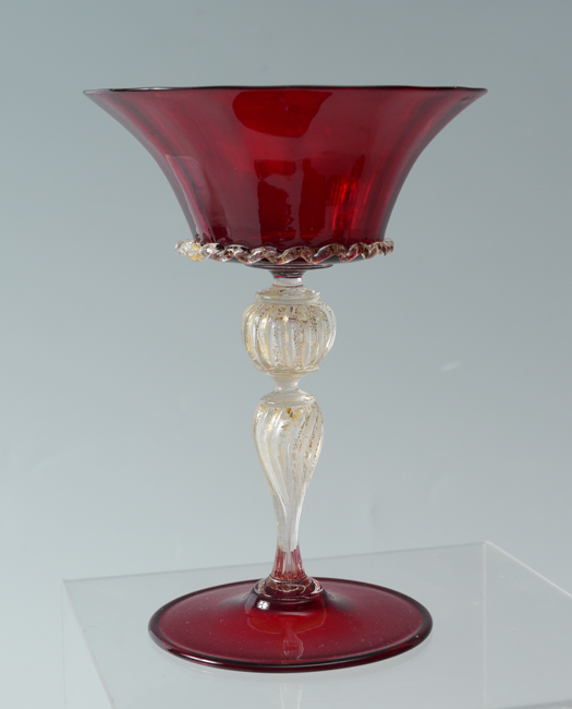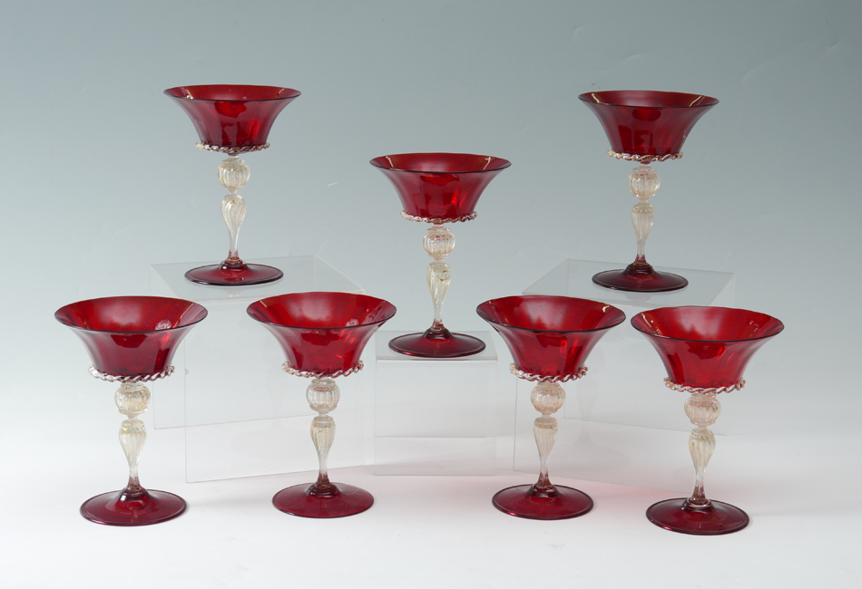 7 PIECE VENETIAN GLASS STEMWARE: Ruby red tops and feet with aventurine stems. 6 1/2'' h. x 4 1/2''.