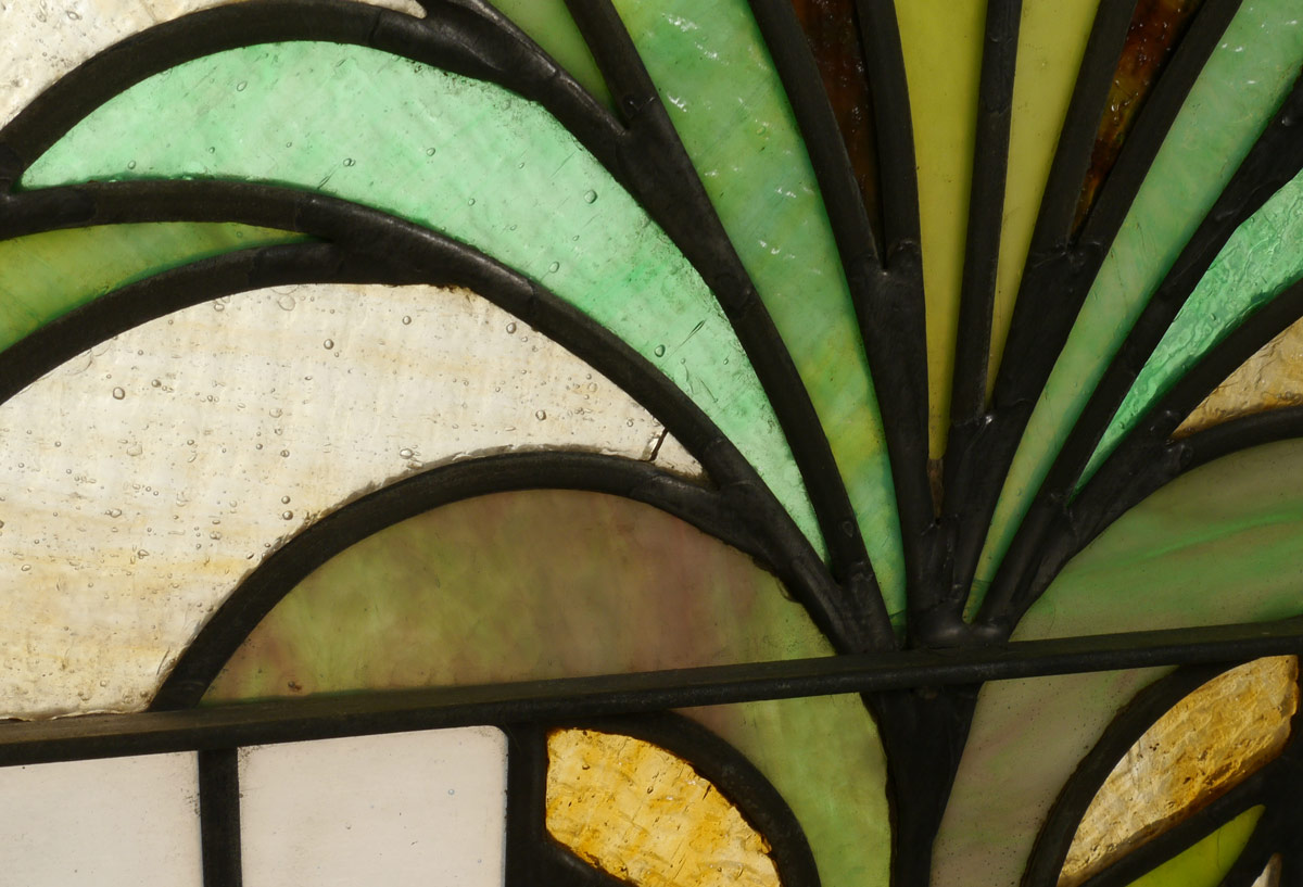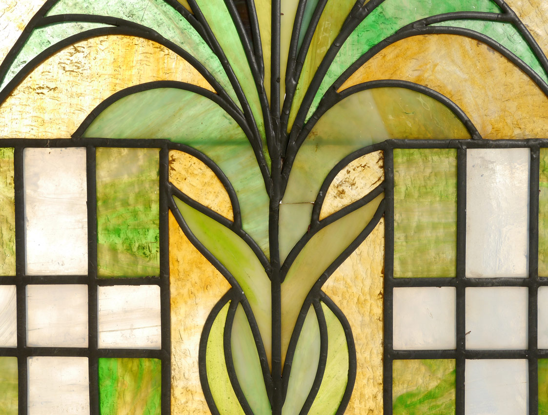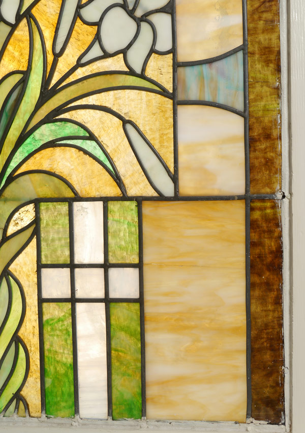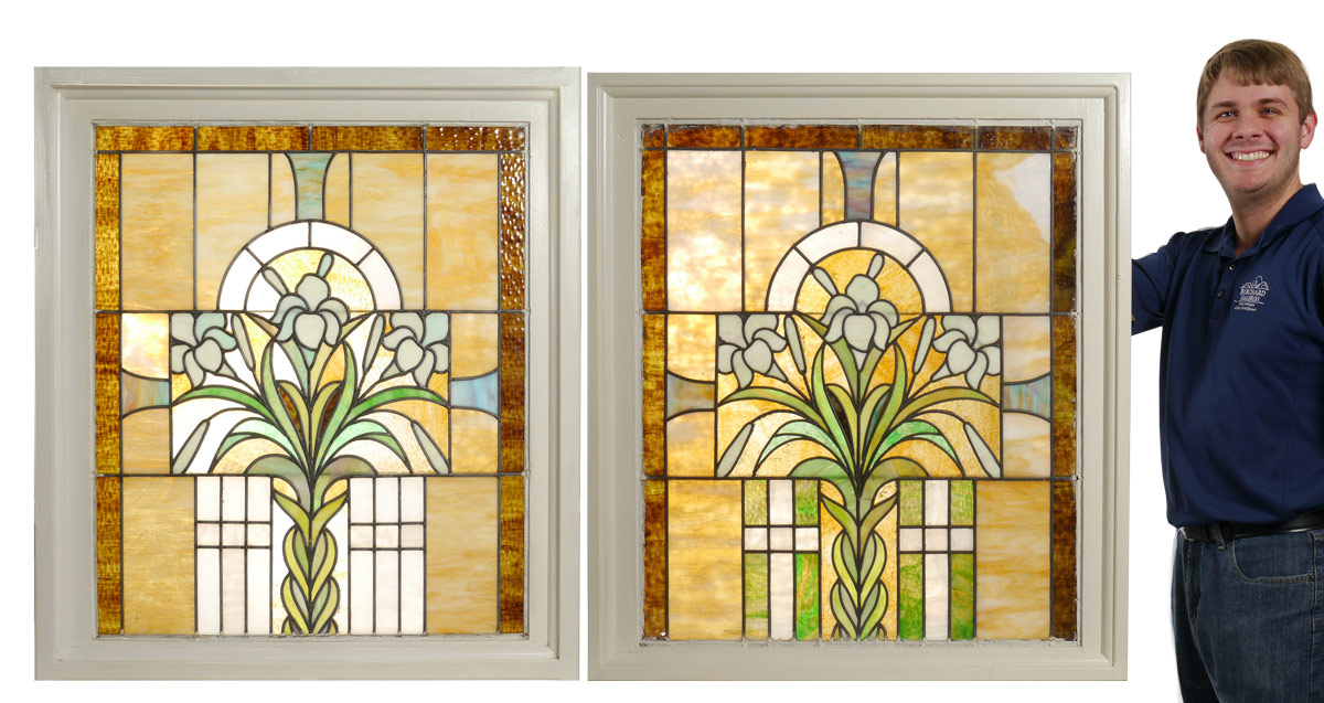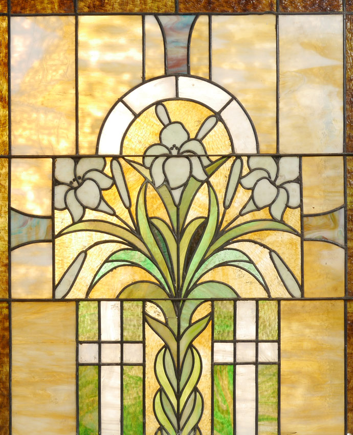 PAIR OF FRAMED STAINED GLASS PANELS: Central lily with 3 flowers. Note slight variance in colors between the two. Interior 35 1/4'' x 29 1/2'', framed 40 3/4'' x 36 1/4''.