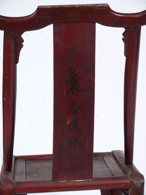 EARLY CHINESE YOKE BACK CHAIR: Shaped back supports and splat, carved skirt. Remnants of red painted finish with writing in characters on back of splat. 39'' h. x 19'' x 15''.