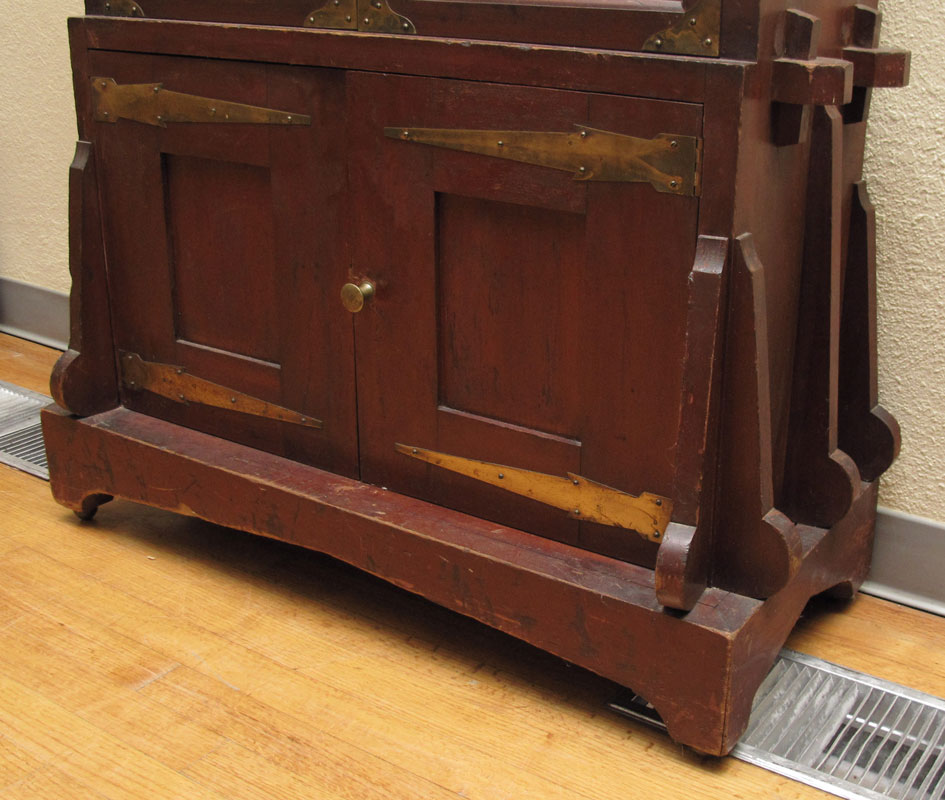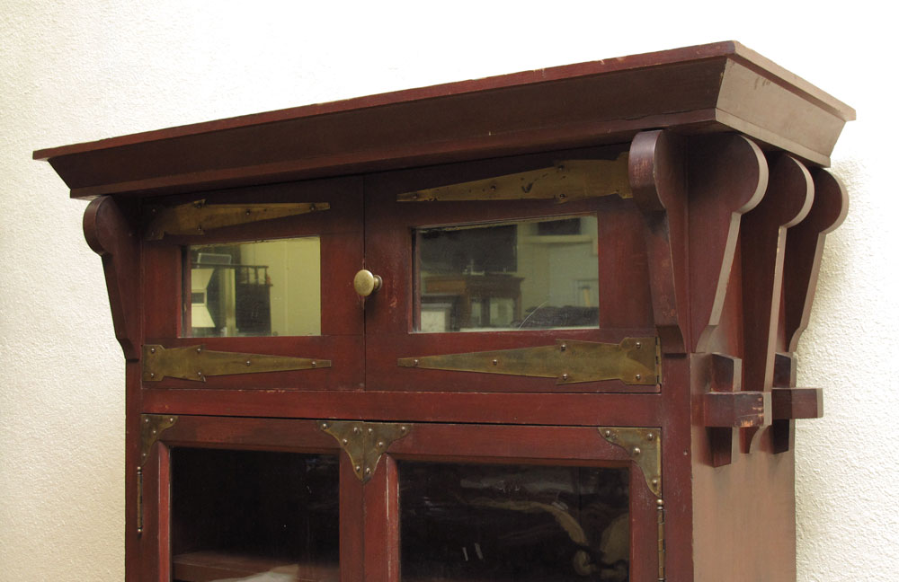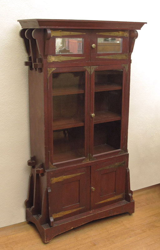 ARTS AND CRAFTS BOOKCASE CABINET: 2 mirrored front top doors with interior shelf over 2 glass doors with 2 interior shelves over 2 paneled doors with shelf. Brass hardware. Applied shaped decoration on sides and front. 65 1/4'' h. x 37'' x 14 3/4''.