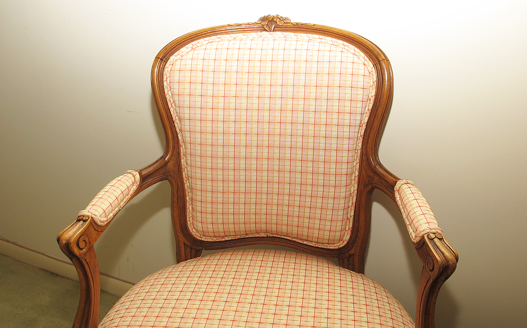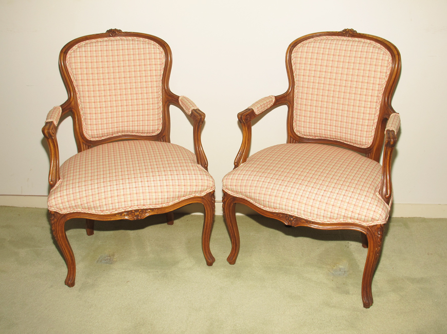 PAIR FRENCH FAUTEUIL CHAIRS: Carved and shaped frames with floral decoration. Pink and white pattern upholstery. 33 1/2'' h. X 22 1/2'' X 22 1/4''. Doris Baker-Mansergh Estate.