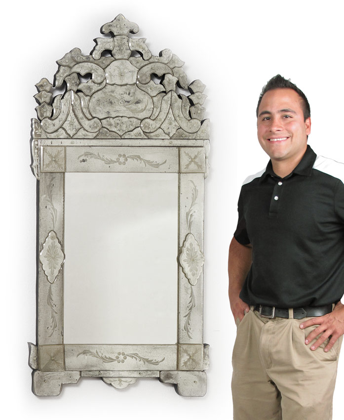 VENETIAN GLASS MIRROR: Decorative crest with foliate under glass designs. 52'' x 25 1/2''