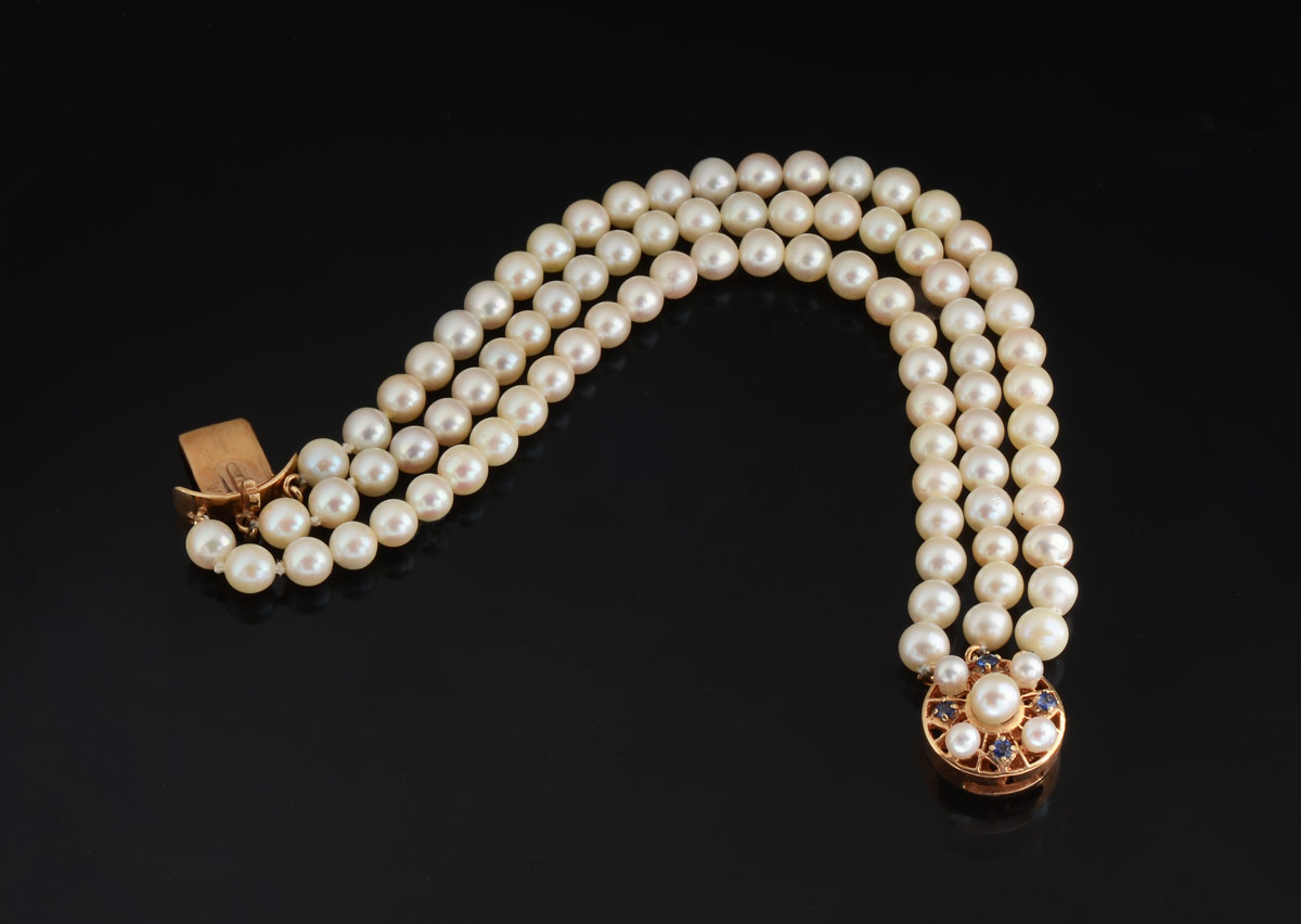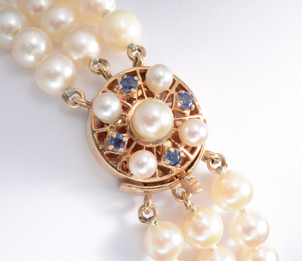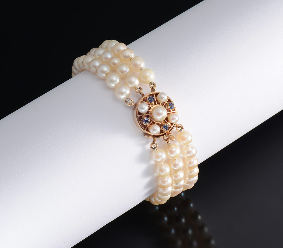 6.00 MM CULTURED PEARL BRACELET: 7'' in length. 3 strands of 6.00 mm cultured pearls. Cream in color, slightly blemished with Low-medium luster. 14K clasp 4 round blue stones. Clasp weight: 3.5 grams Approx.