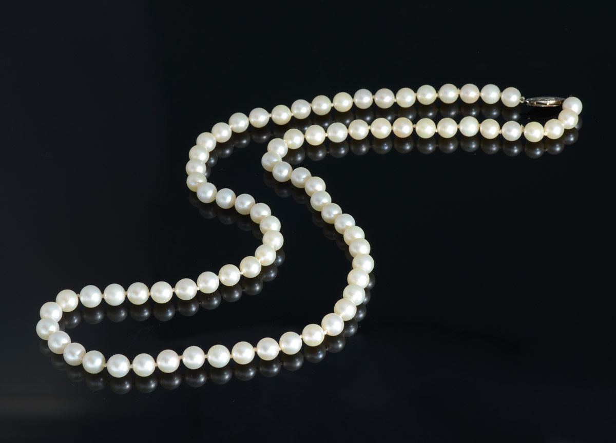 SALT WATER CULTURED PEARL NECKLACE: 23'' strand of creamy white pearls with a nice luster. Pearls are 6.5-7 mm.