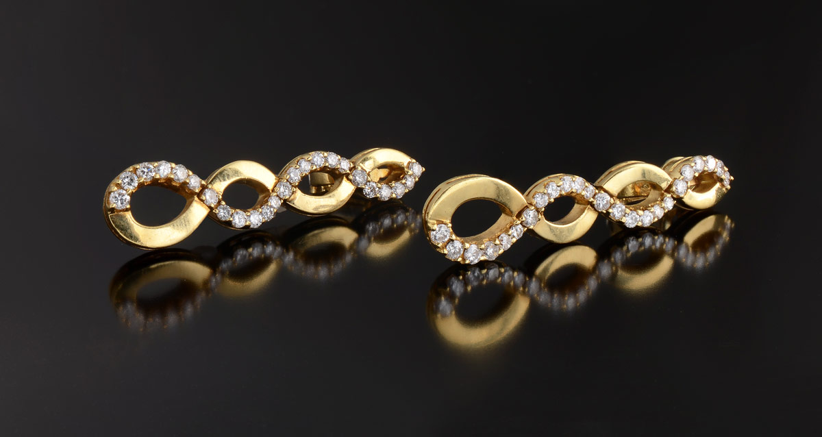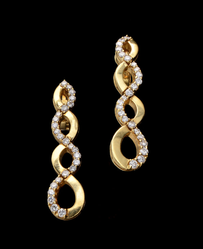 ELEGANT 18K DIAMOND EARRINGS: 18K yellow gold earrings of 48 round brilliant cut diamonds totaling approx. 1.50 Ct., averaging VS in clarity and G-H in color. The diamonds are prong set. Hinged clip closures. Length: 1 5/8''. Weight: 12.7 grams.