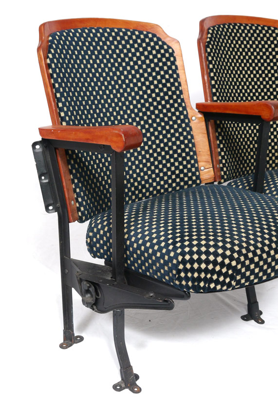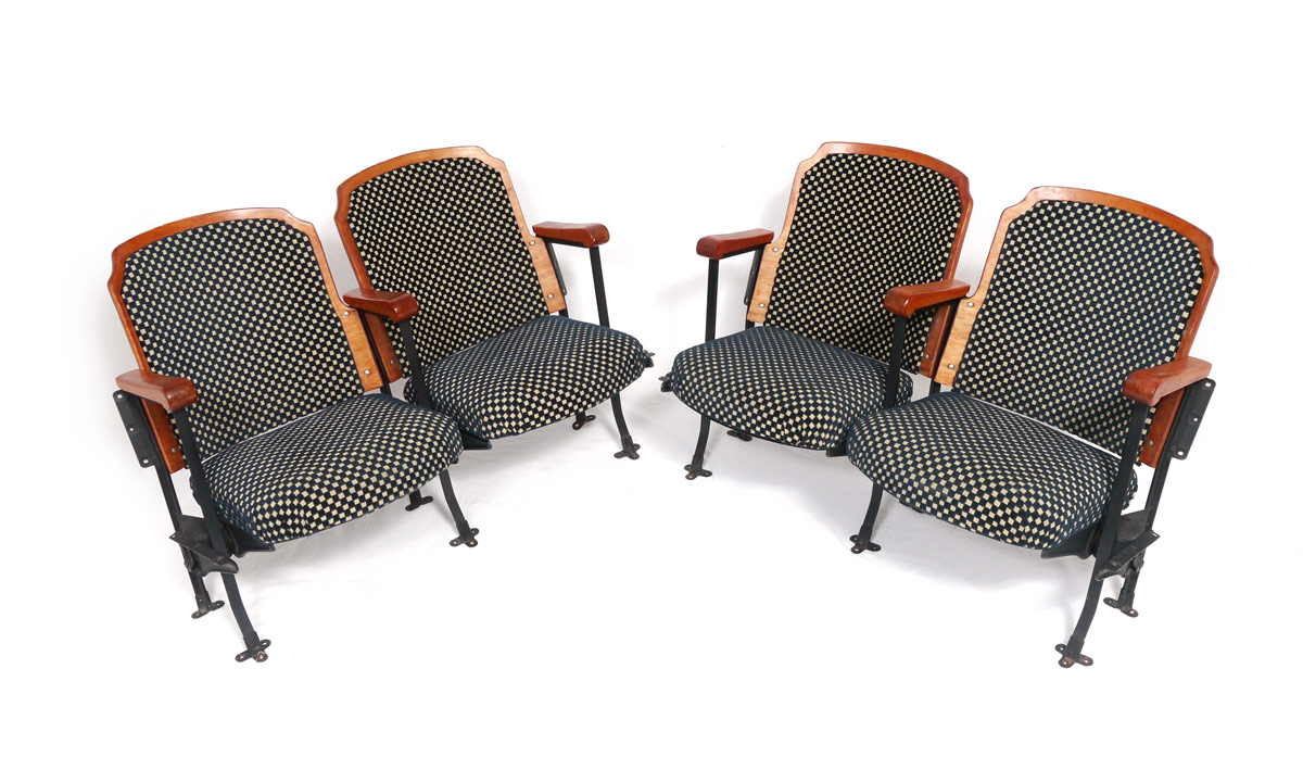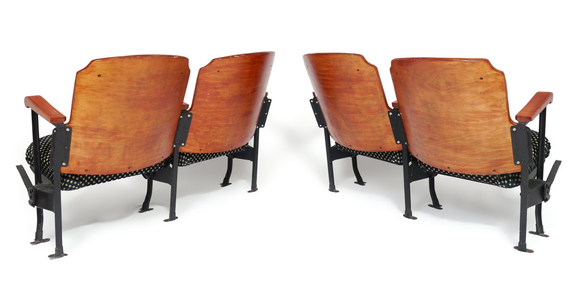 VINTAGE WISCONSIN MOVIE THEATRE SEATS: 2 pairs of 2 chairs each, laminated wood frames with cast iron supports, checkerboard seats and backs. Seats lift. 31 3/4'' h. x 47 1/2'' x 28''.