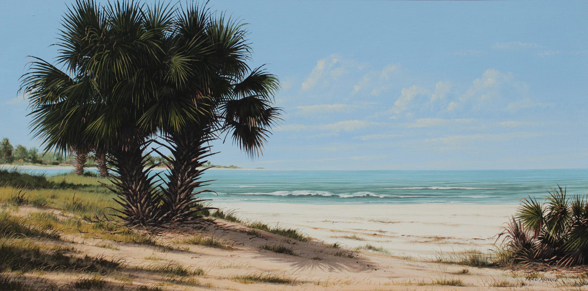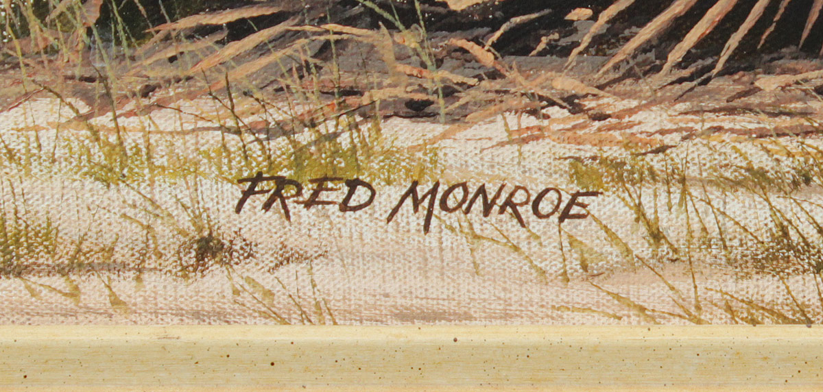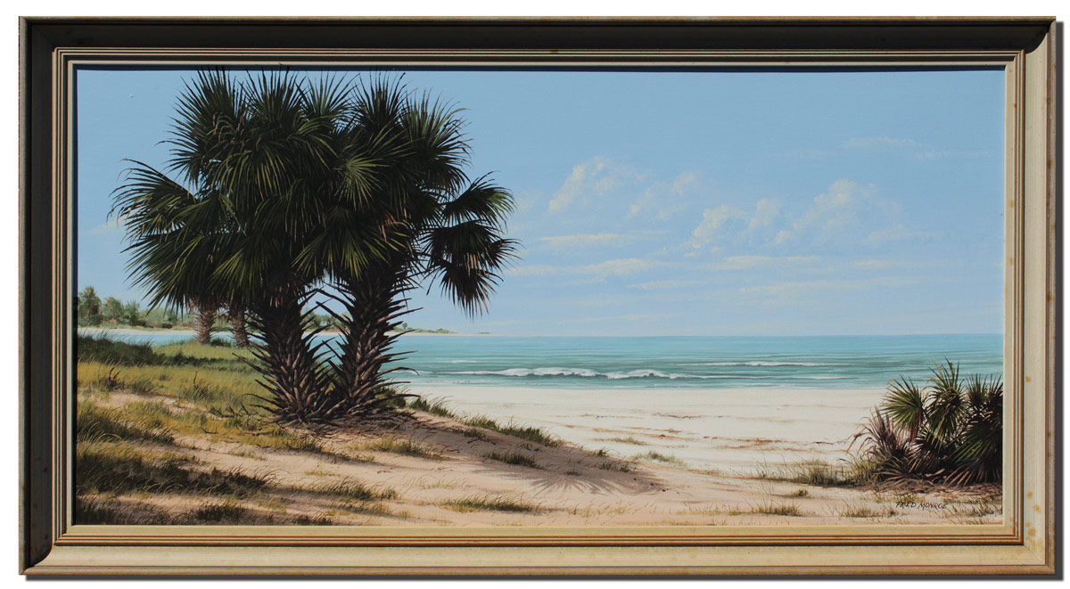 MONROE, Fred, (American, 1900- ): Florida Beach Scene, Oil/Canvas, 24'' x 48'', signed lower right, painted frame, 28 1/2'' x 53''.