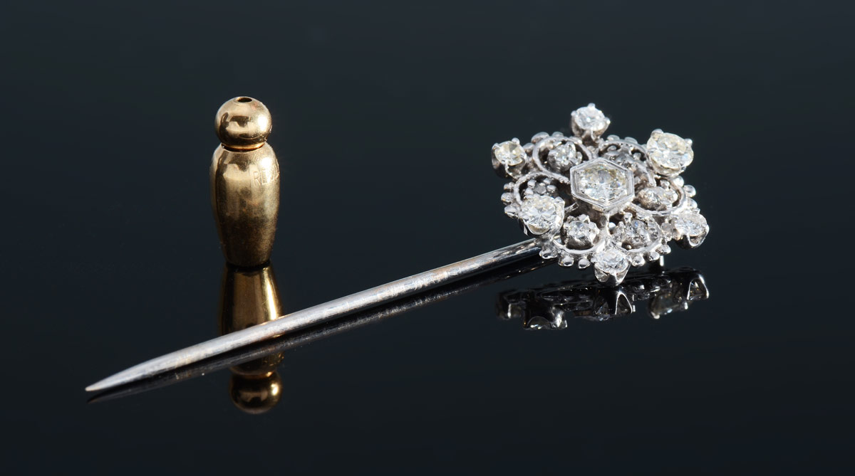 14K DIAMOND STICK PIN: 14K yellow gold snowflake stick pin contains 13 round brilliant cut diamonds totaling approx. .80 Ct. VS-SI in clarity and H-I in color. Diameter: .75''. Weight: 3.1 grams.