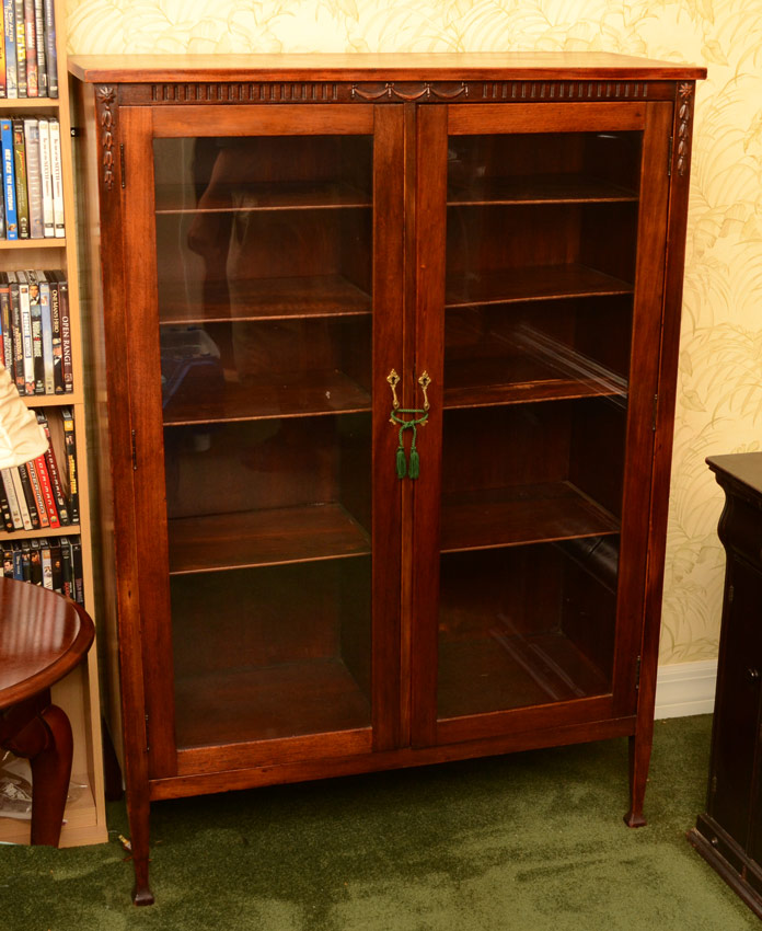 MAHOGANY 2 DOOR BOOKCASE: Applied and carved decoration. 2 glass doors with 4 shelves either side, tapered legs. 54 3/4'' h. x 38 1/2'' x 16 1/2''.