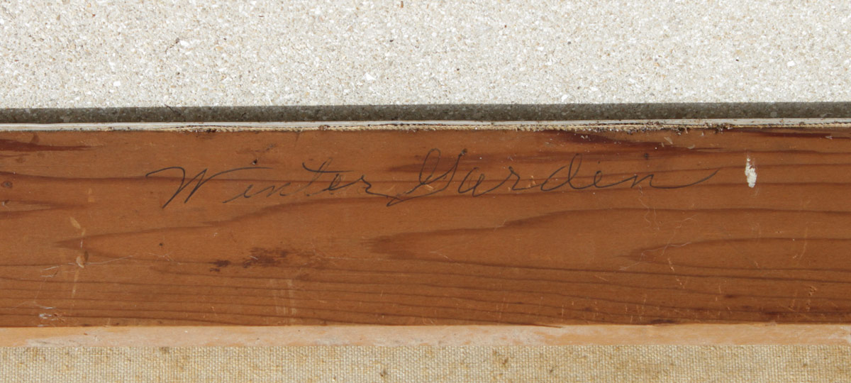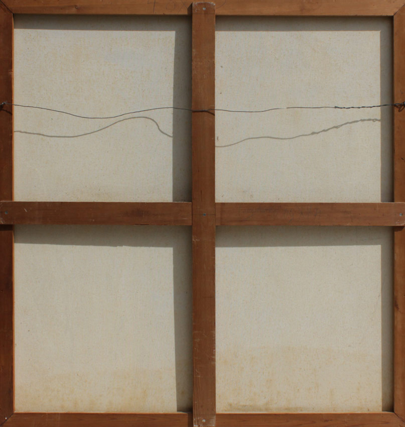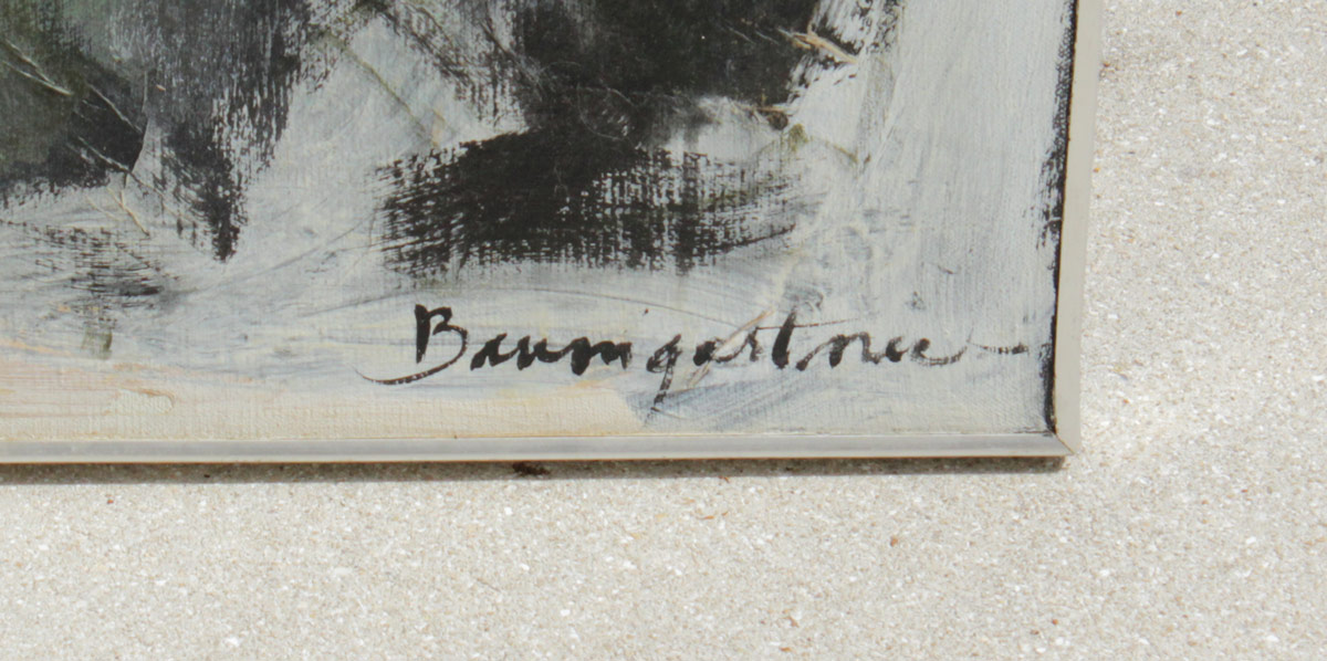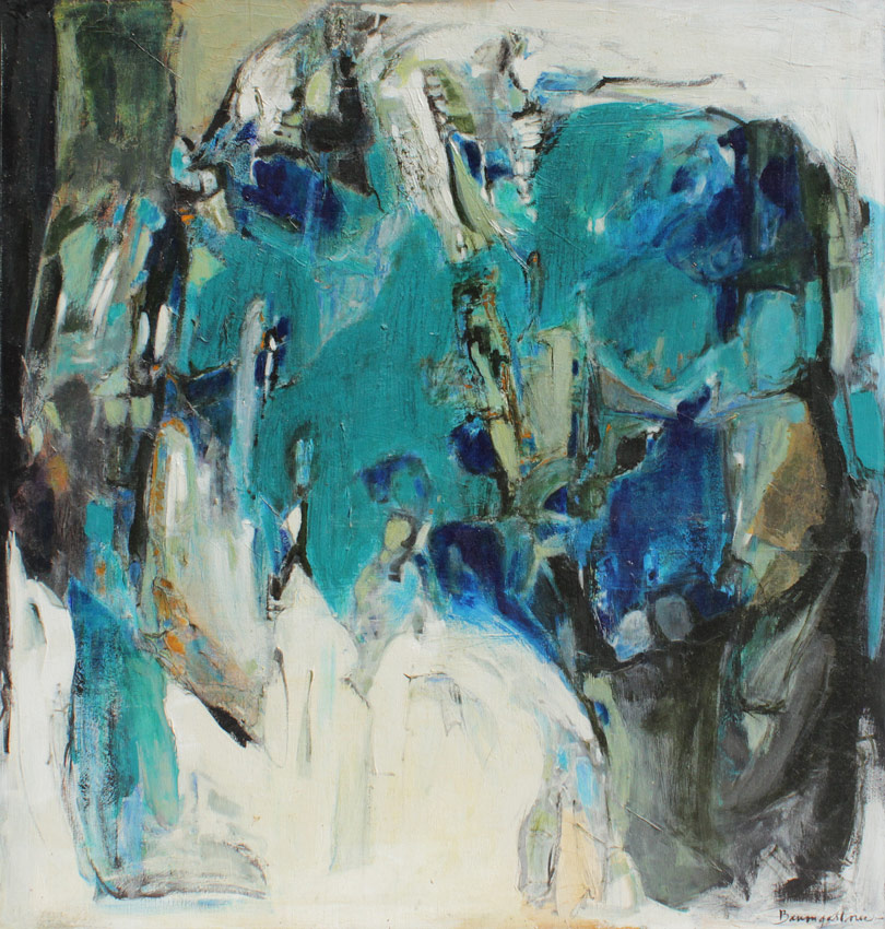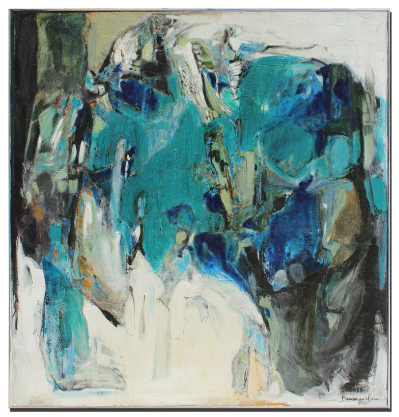 LARGE BAUMGARTNER ABSTRACT: Abstract with Blues and Greens, 50'' x 48'', signed lower right, also signed on the stretcher verso, thin edge metal frame with wear.
