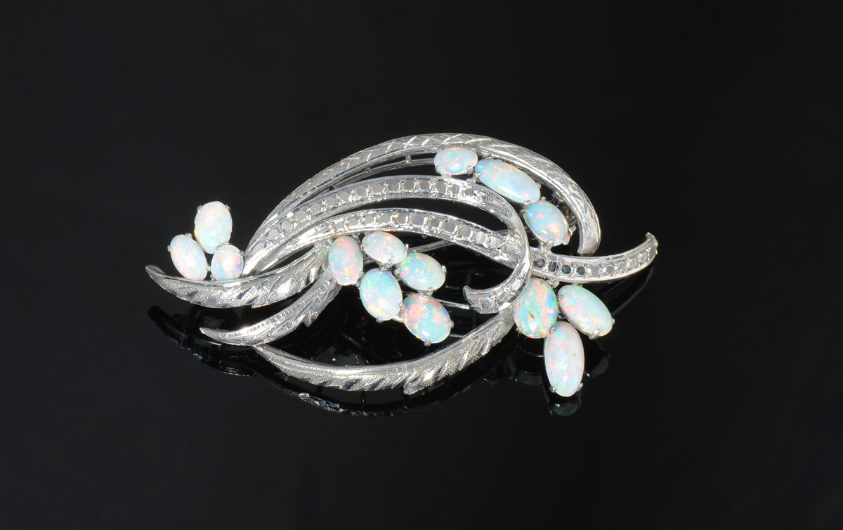 18K OPAL BROOCH: 18K white gold brooch contains fourteen oval cabochon cut opals totaling approx. 2.75 Ct. Approx. Red/orange and blue/green play-of-color. Brightness level - 1.5 The opals are prong set. Approx. 2'' in length. Weight: 8.2 grams.