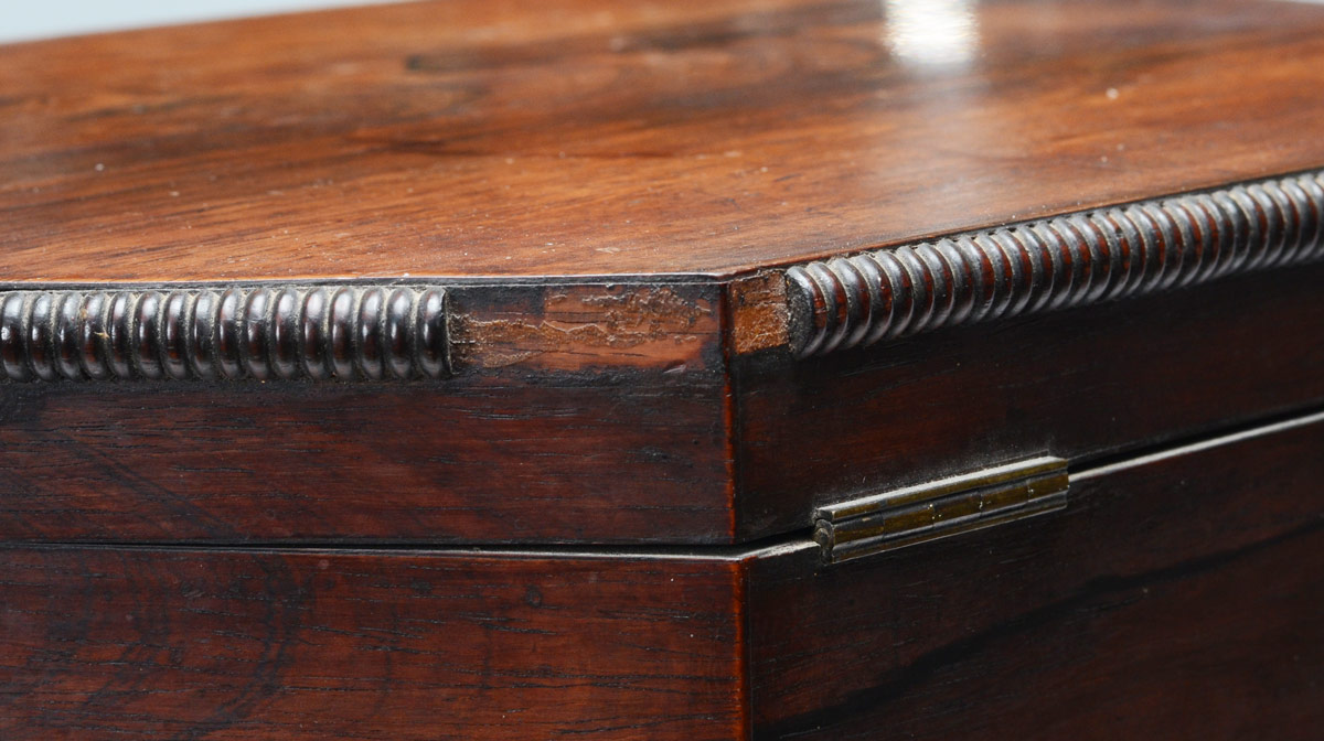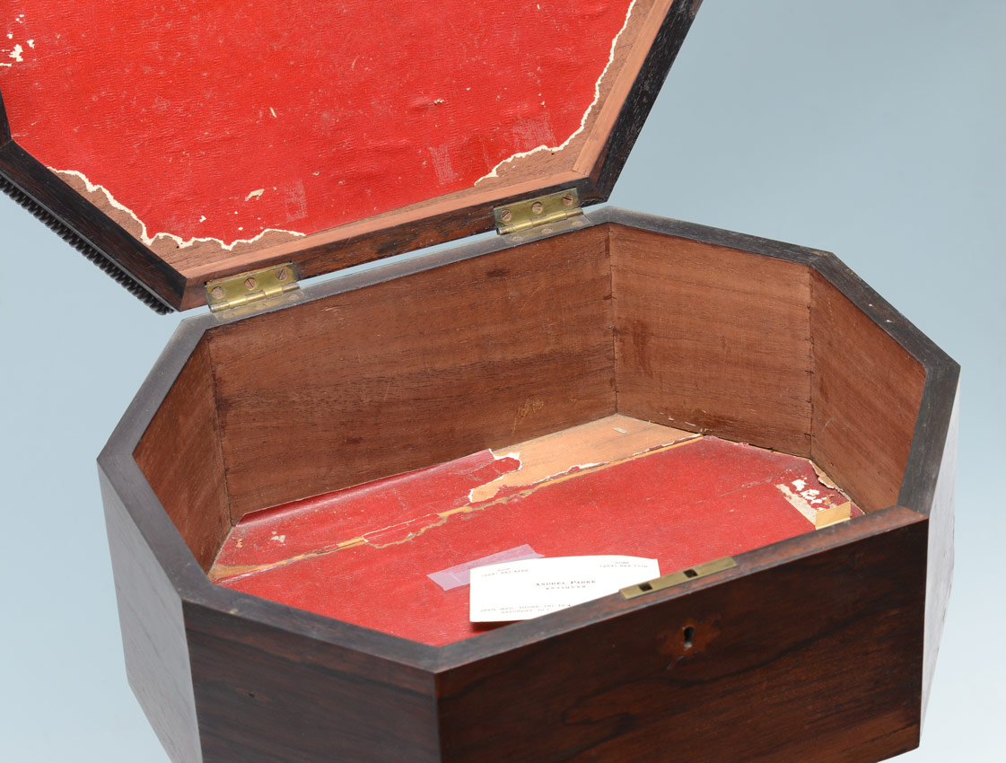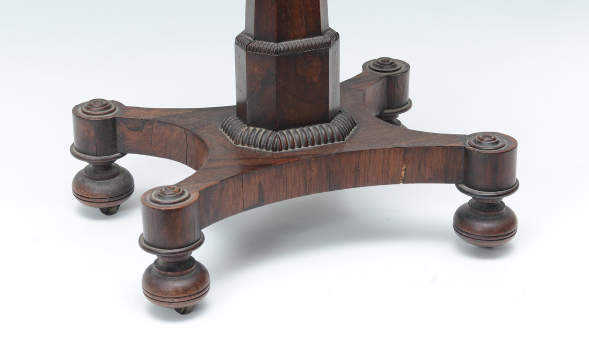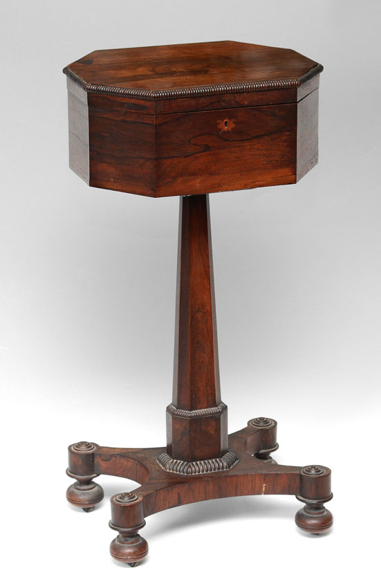 ENGLISH REGENCY ROSEWOOD TEA POY ON STAND: Hinged lid with open compartment and carved trim. Matching trim at base, on bun feet. 29 3/4'' h. x 15'' x 12''.