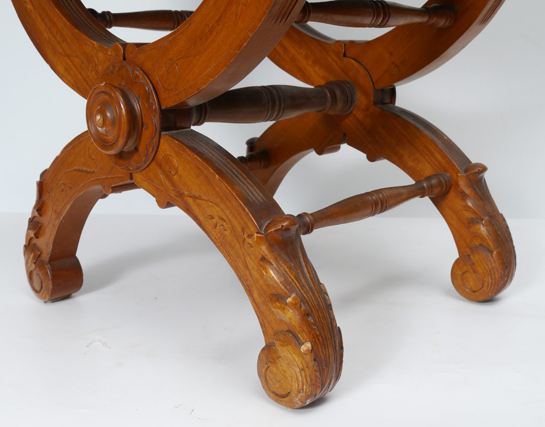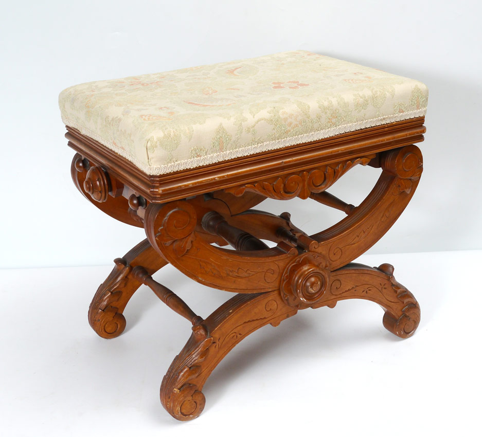 VICTORIAN ADJUSTABLE X FRAME PIANO STOOL: Carved frame and adjustable height by turning knobs on either side. Floral upholstery seat. 18 1/2'' h. x 22 1/2'' x 14 1/2''.
