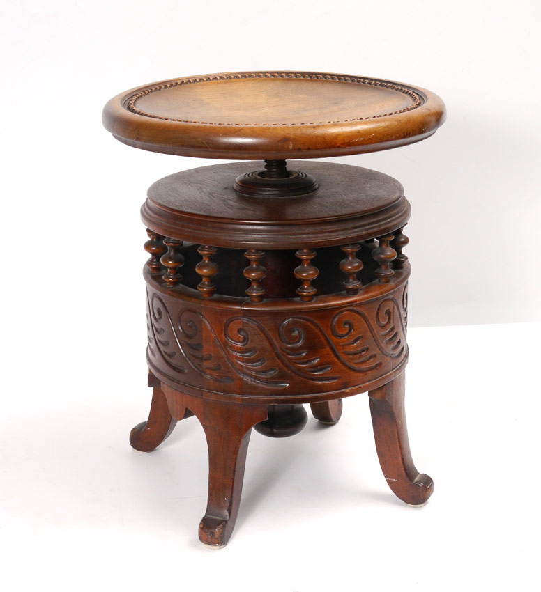 NORWEGIAN CARVED PIANO STOOL: Seat rotates and rises, carved skirt. 15 3/4'' h. x 14 1/4''.