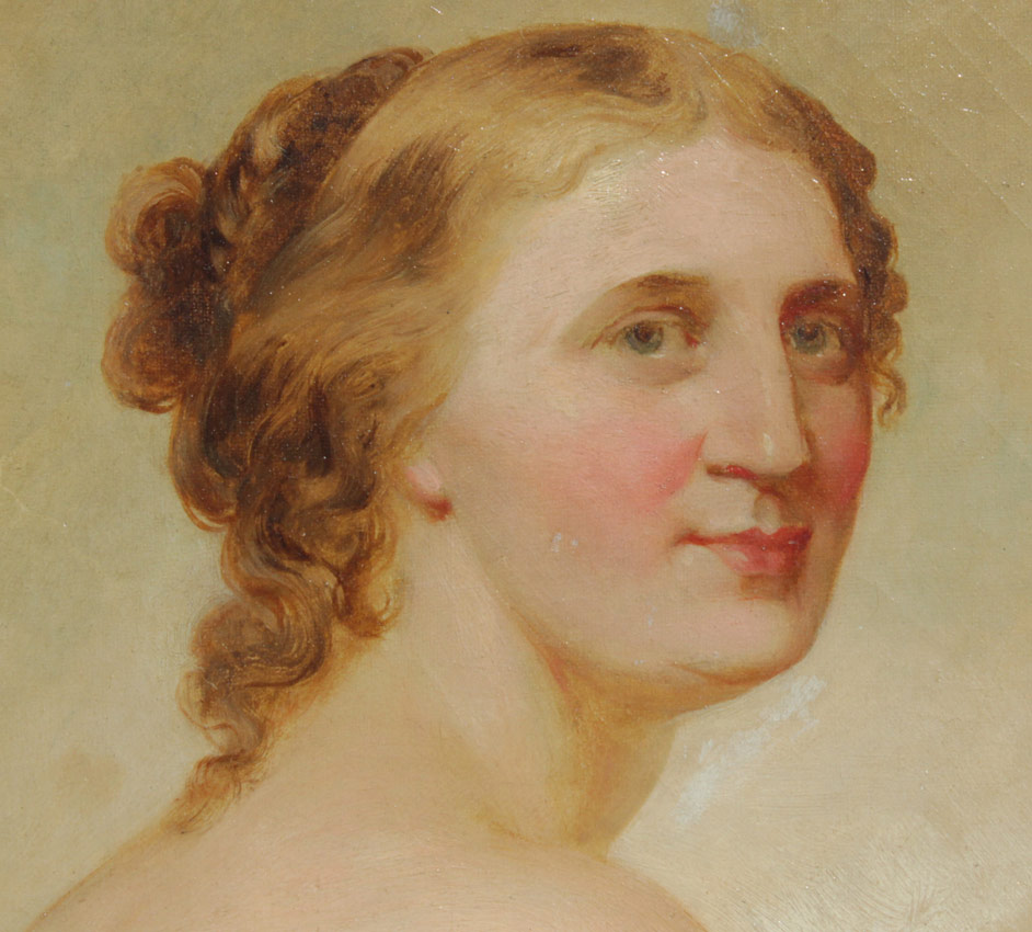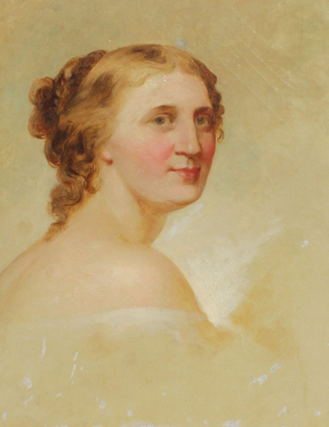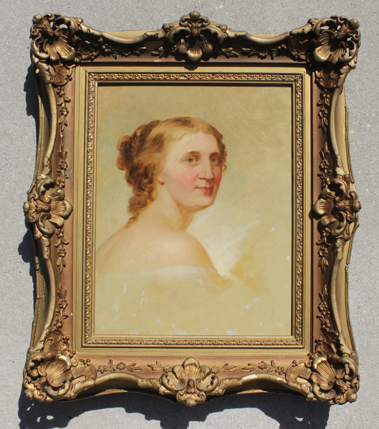 GOOD 19TH CENTURY PORTRAIT PAINTING OF A WOMAN: Oil/Canvas, 14'' x 12'', encased in period gilded and pierced carved frame with overpaint, wear, and repair 20'' x 17 1/2''.