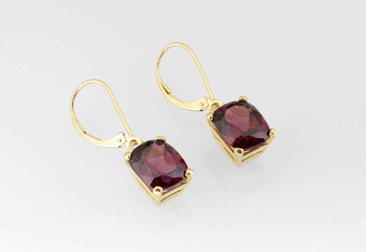 18K 10.00 CTW GARNET EARRINGS: 18K yellow gold earrings contain two rectangular cushion shaped rhodolite garnets. Weight: 10.00 Ct. Approx. The garnets are prong set. Weight: 3.9 grams. Approx.