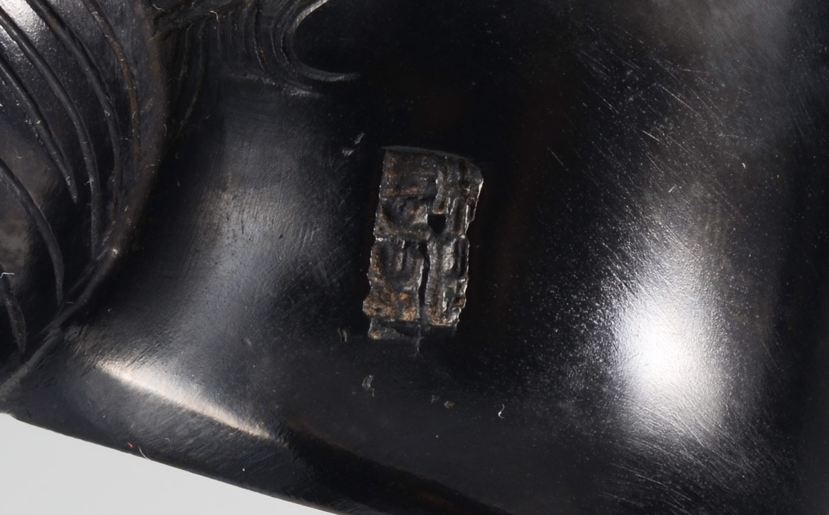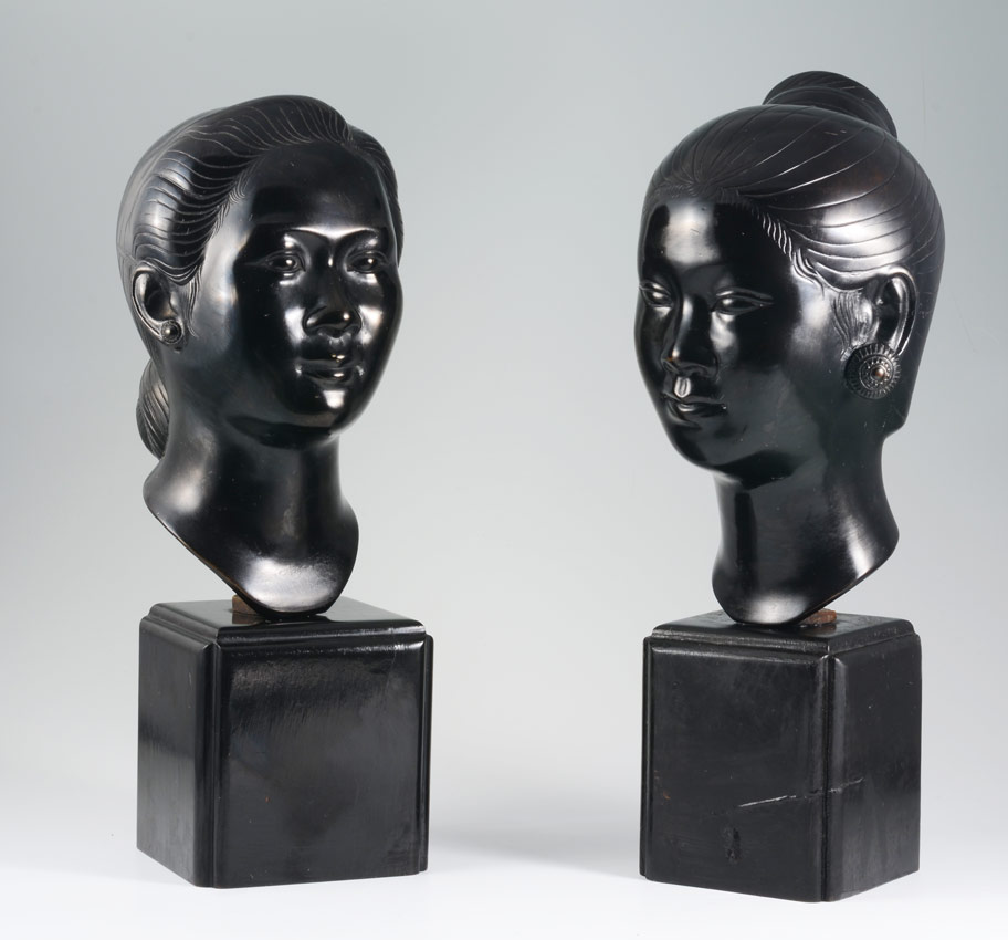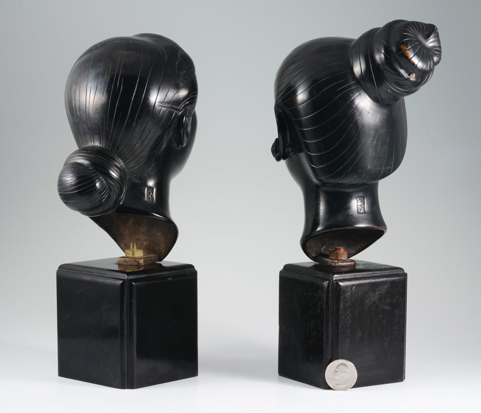 TWO ARTIST SIGNED ORIENTAL BRONZE BUSTS: Each an individual beauty, 10 1/2'' and 11 1/2'' total height with affixed wooden plinth.
