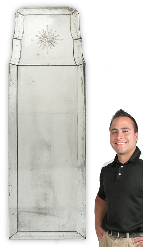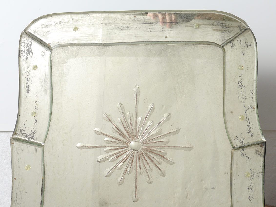 OBLONG VENETIAN ETCHED GLASS MIRROR: Rosette under glass top panel, 66 3/4'' x 20''