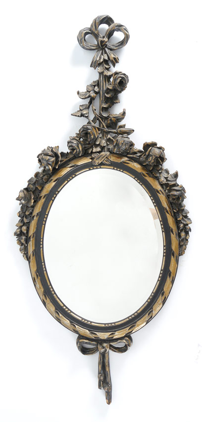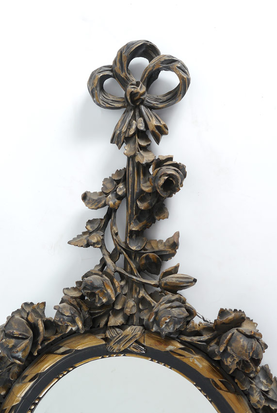 CARVED & GILDED FLORAL WALL MIRROR: Carved wood ribbon over floral motif frame with gold decoration. Measures 46 1/4'' h. x 20'' x 3 1/2''.
