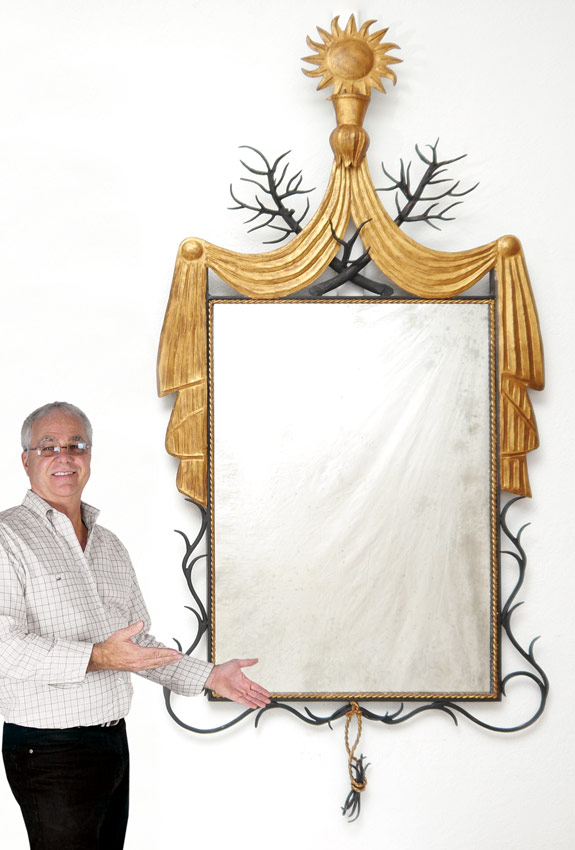 PAINT DECORATED METAL FRAMED WALL MIRROR: Frame featuring the sun over swags and branches. Gold and black painted. 76'' x 34 1/2''