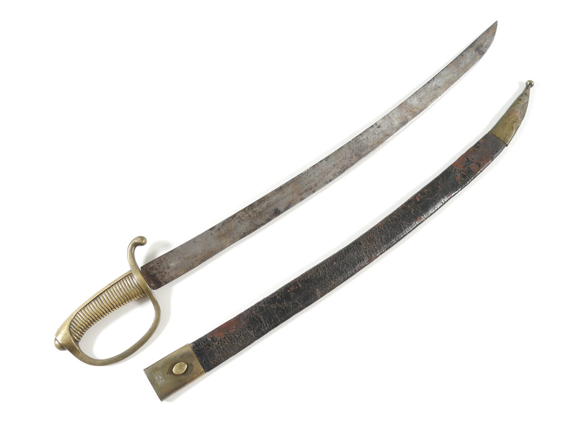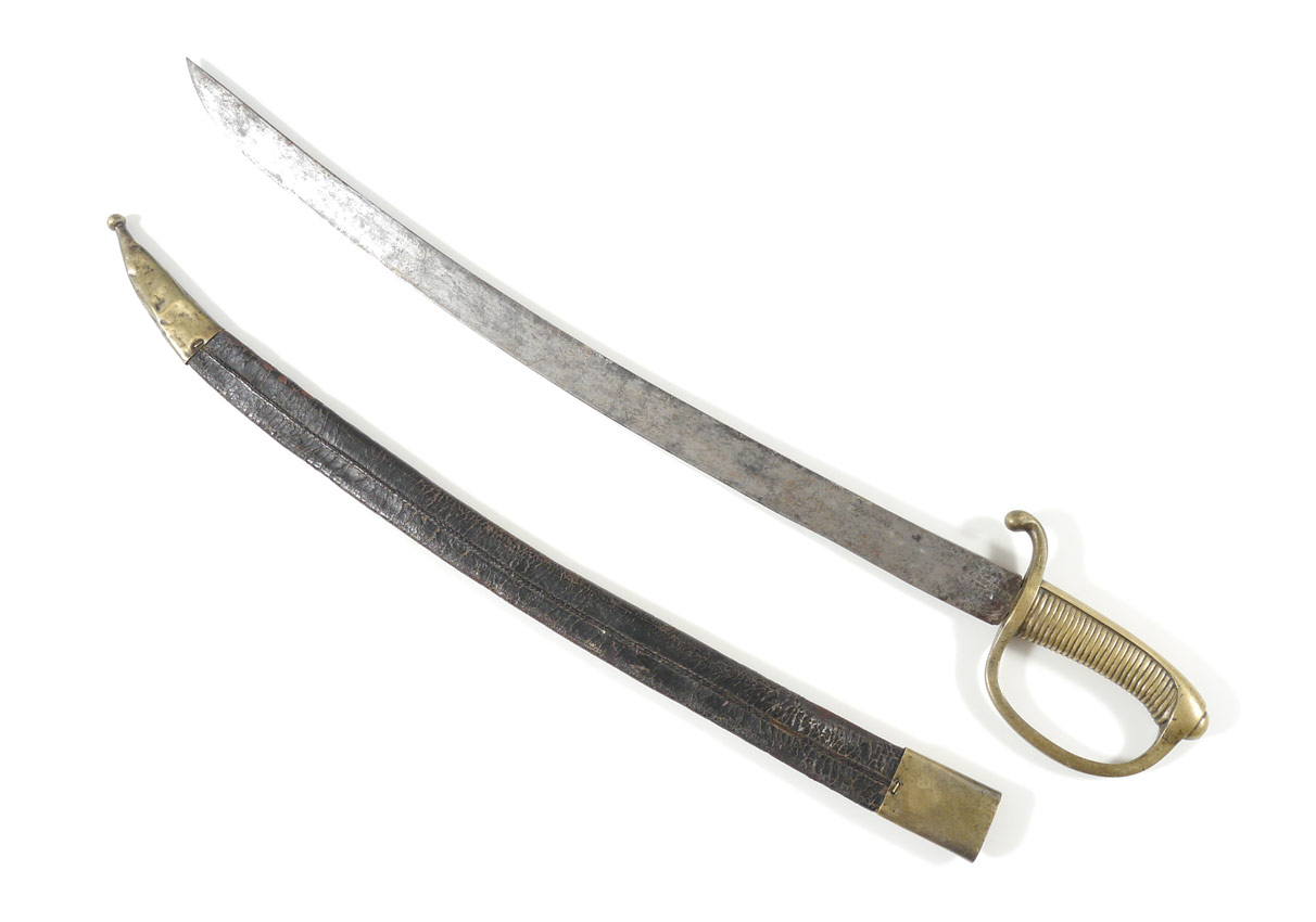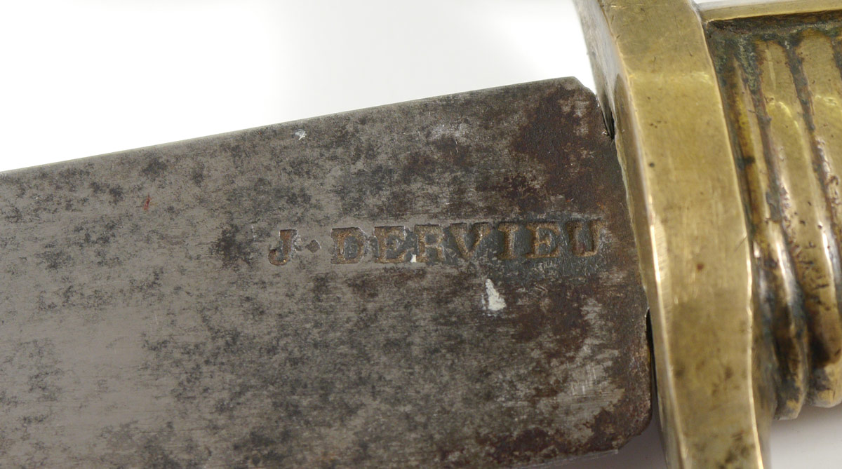 J. DERVIEU FRENCH ARTILLERY SWORD: Mid 19th century French artillery sword with all brass hilt and grip, 24'' blade marked J. Dervieu. Leather scabbard with brass mounts. Overall 30 1/4'' long.