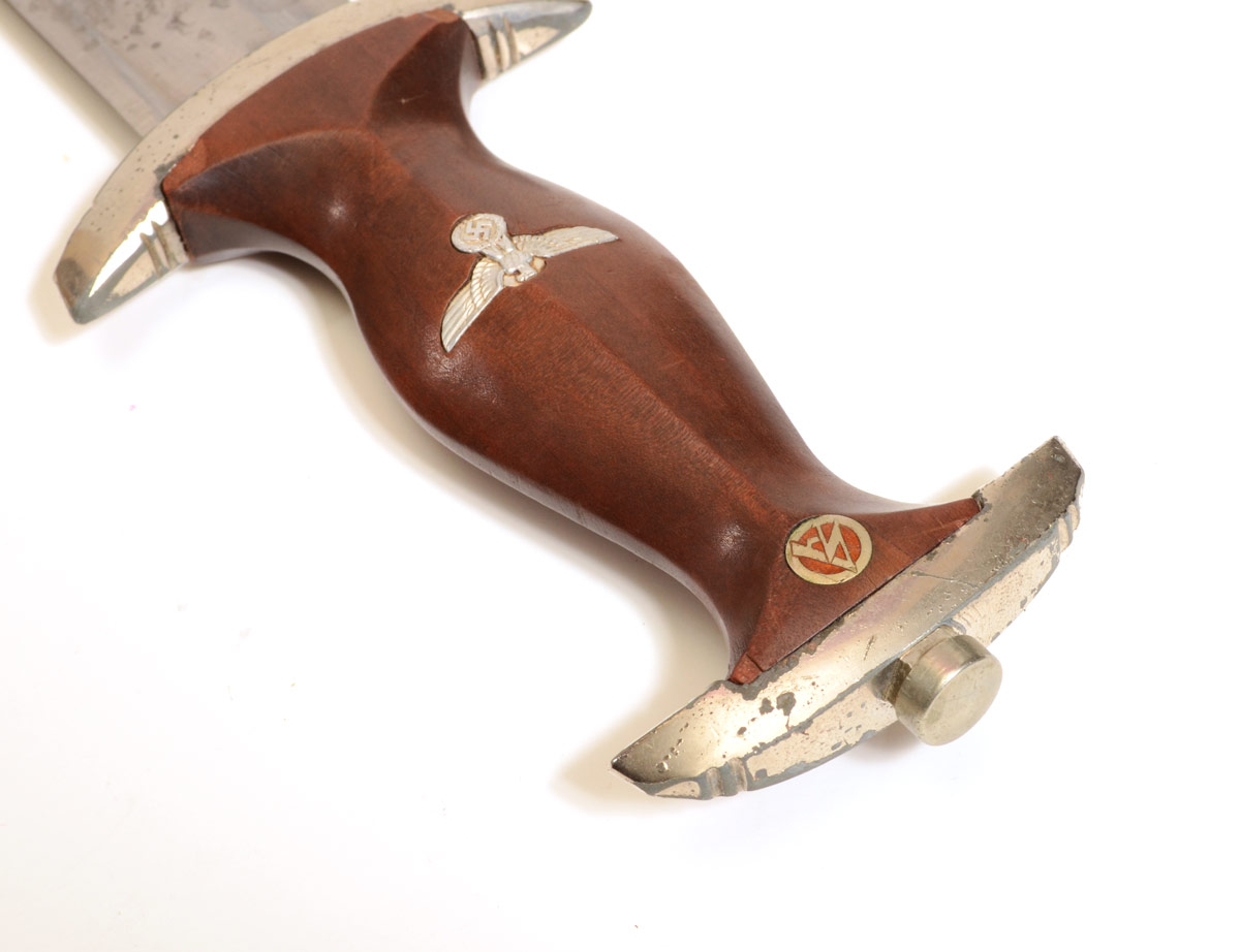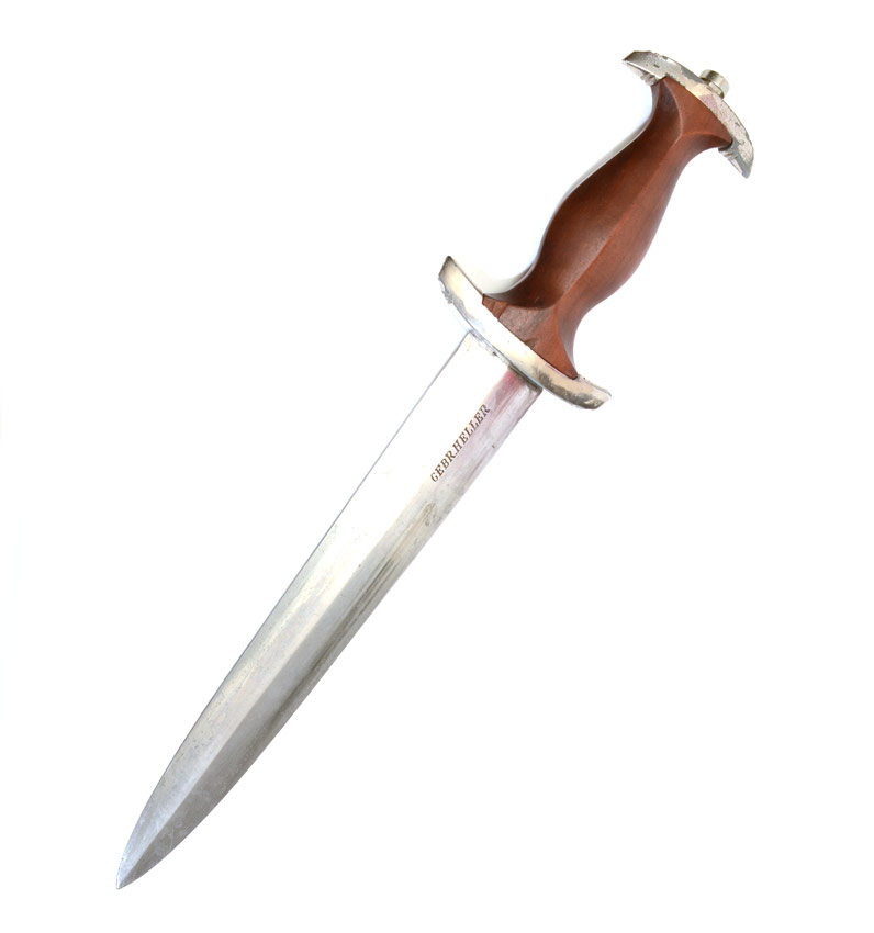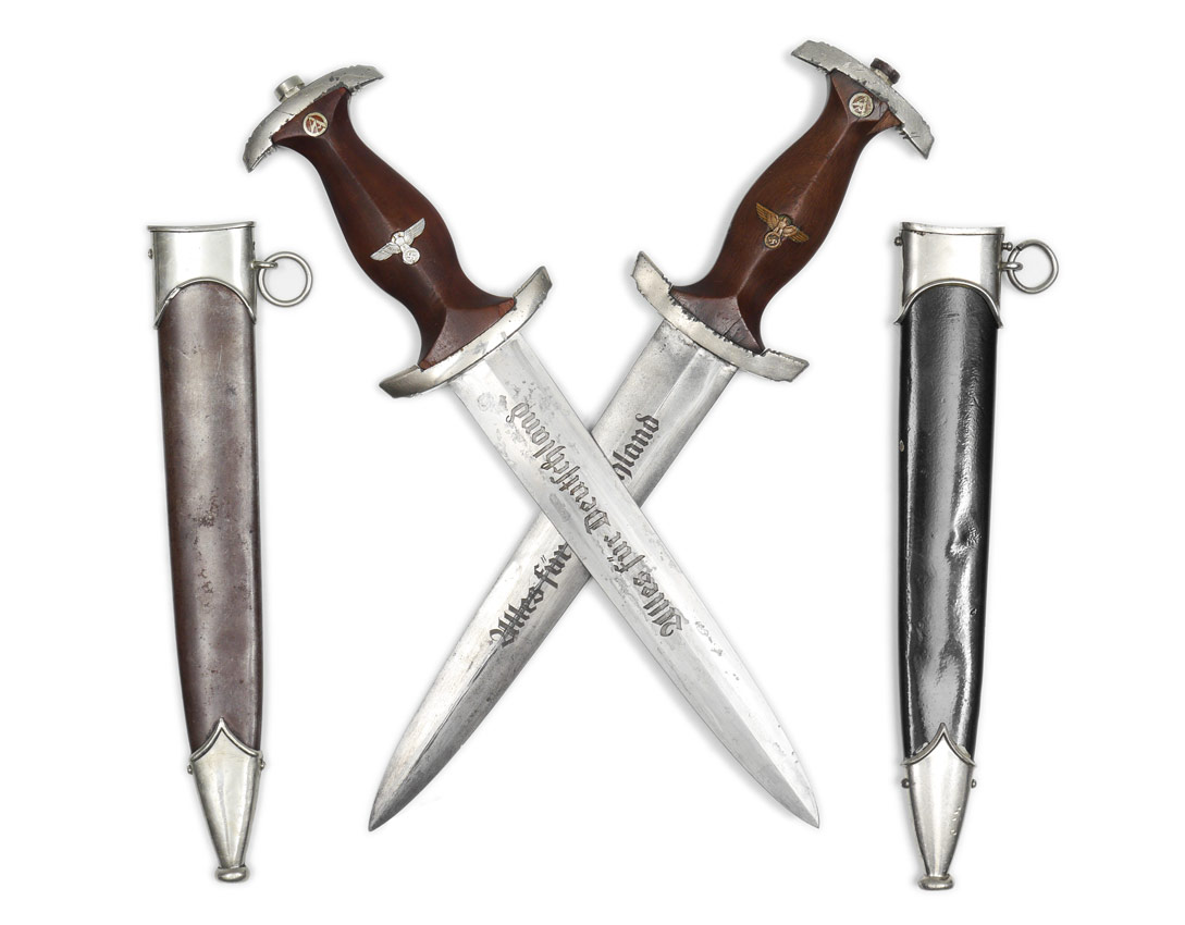 2 WWII GERMAN SA DAGGERS: To include 1) Marked Gerb. Heller with motto on 8 1/4'' blade. Original metal sheath. 2) RZ dated 1941 on 8 5/8'' blade. Sheath may be repainted or replacement.