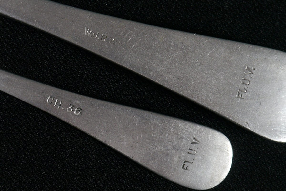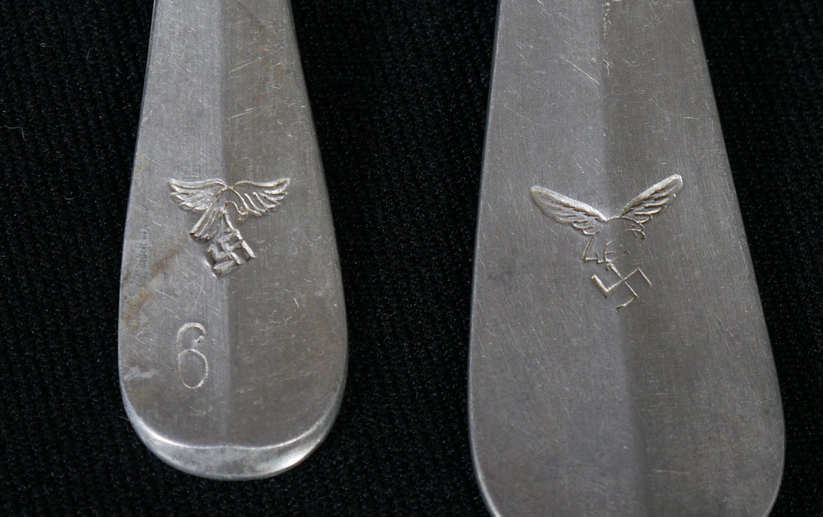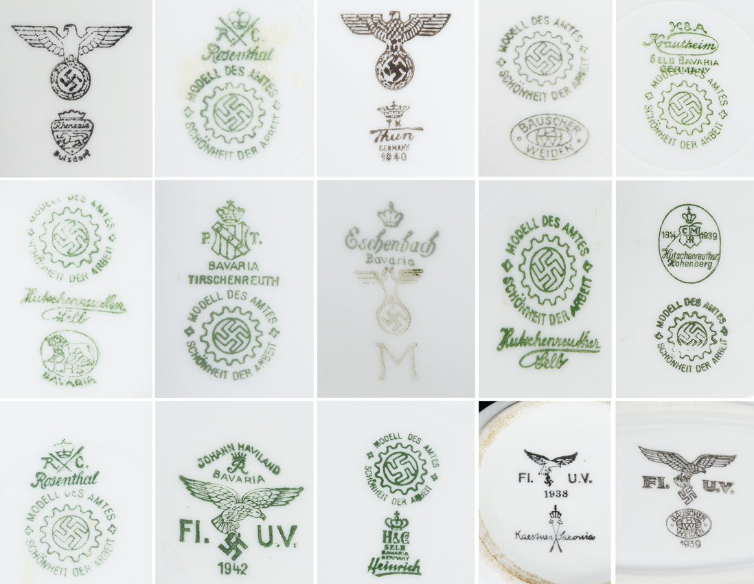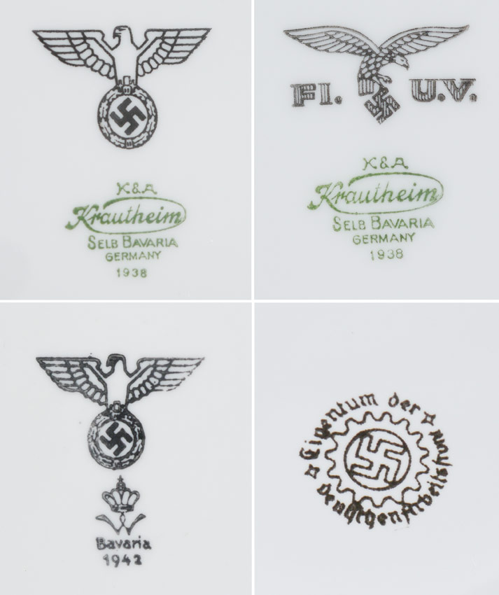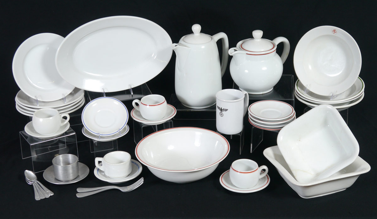 ASSEMBLED COLLECTION OF WWII GERMAN CHINA: A 30 piece assembled collection of WWII era china by various makers, with varying German party marks includes a water pitcher 11 1/4'' h. x 9'', pitcher (8'' x 10'') and bowl (3 1/2'' x 11 3/4'') set. Sold with 2 aluminum forks, 4 spoons, cup and saucer.