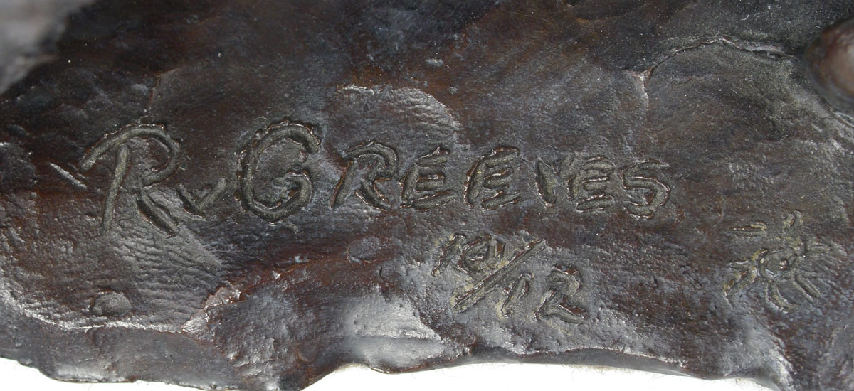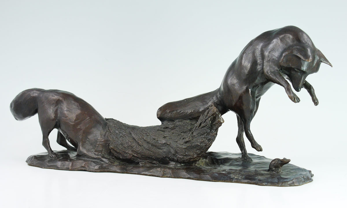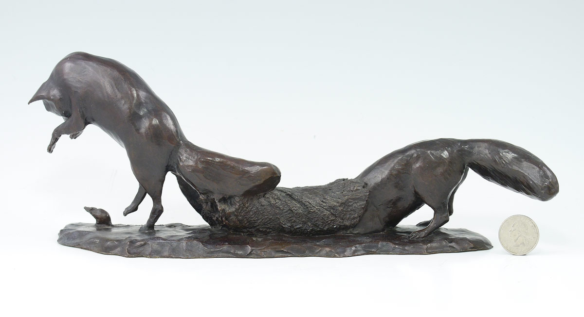 GREEVES, Richard Vernon, (American, 1935- ): Bronze Grouping of Two Foxes Chasing a Mouse, 5 1/2'' h. x 13'' l. x 4'' depth, incised signature, #'d 10/12.
