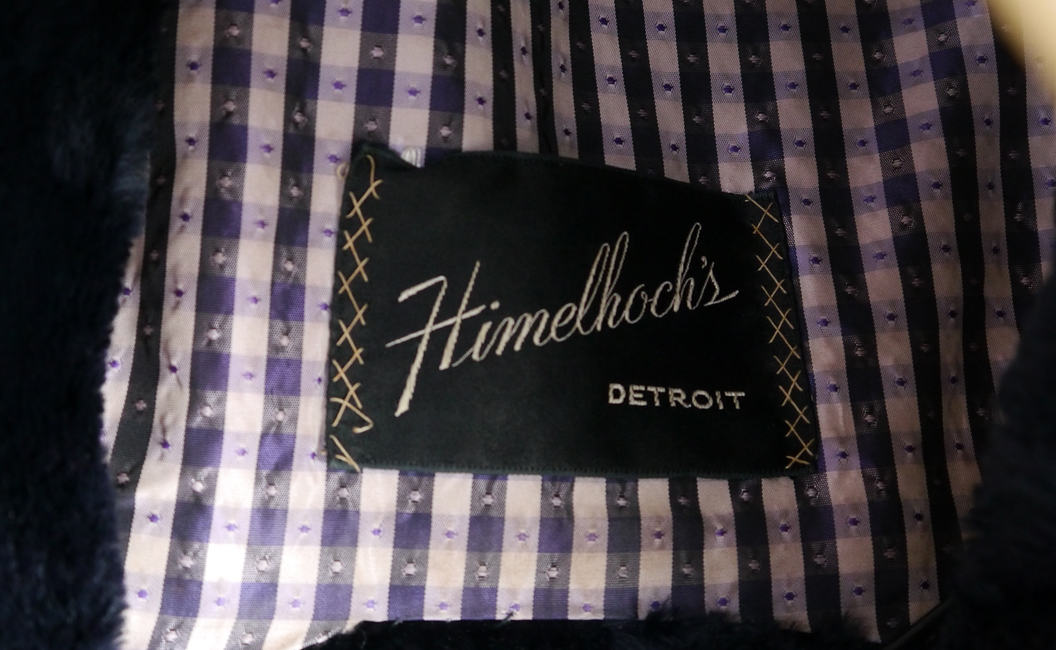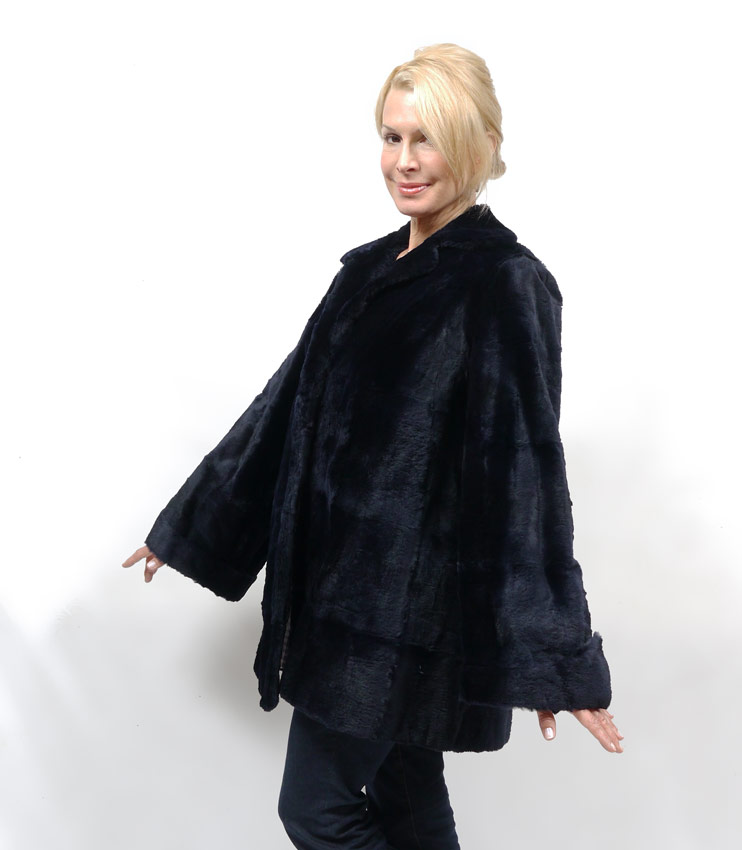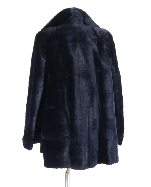 SEAL FUR JACKET: Blue black seal fur car coat length swing jacket with full bell sleeves. Sporty lining, Himelbrochs Detroit label. Larger size measures approx. 31'' collar to hem and 19: shoulder to shoulder.