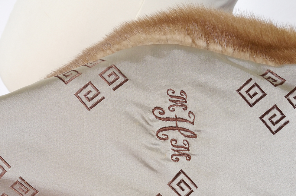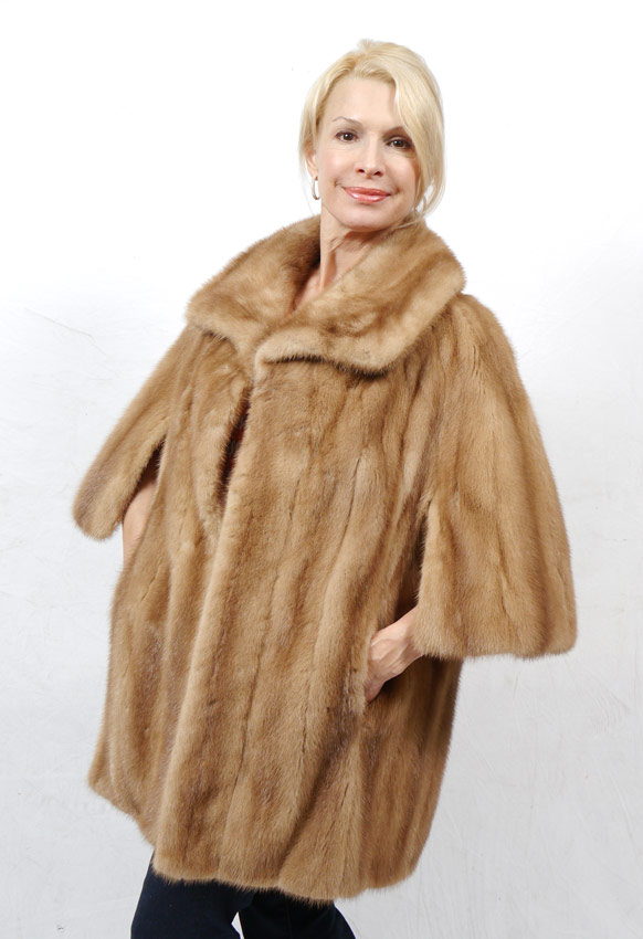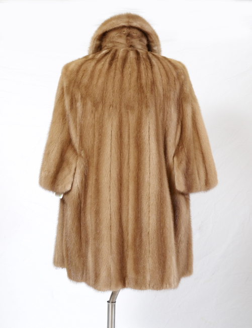 CAR COAT LENGTH MINK FUR JACKET: Caramel color, 3/4 open sleeves, wide collar. Measures approx. 31'' collar to hem, 19'' shoulder to shoulder.