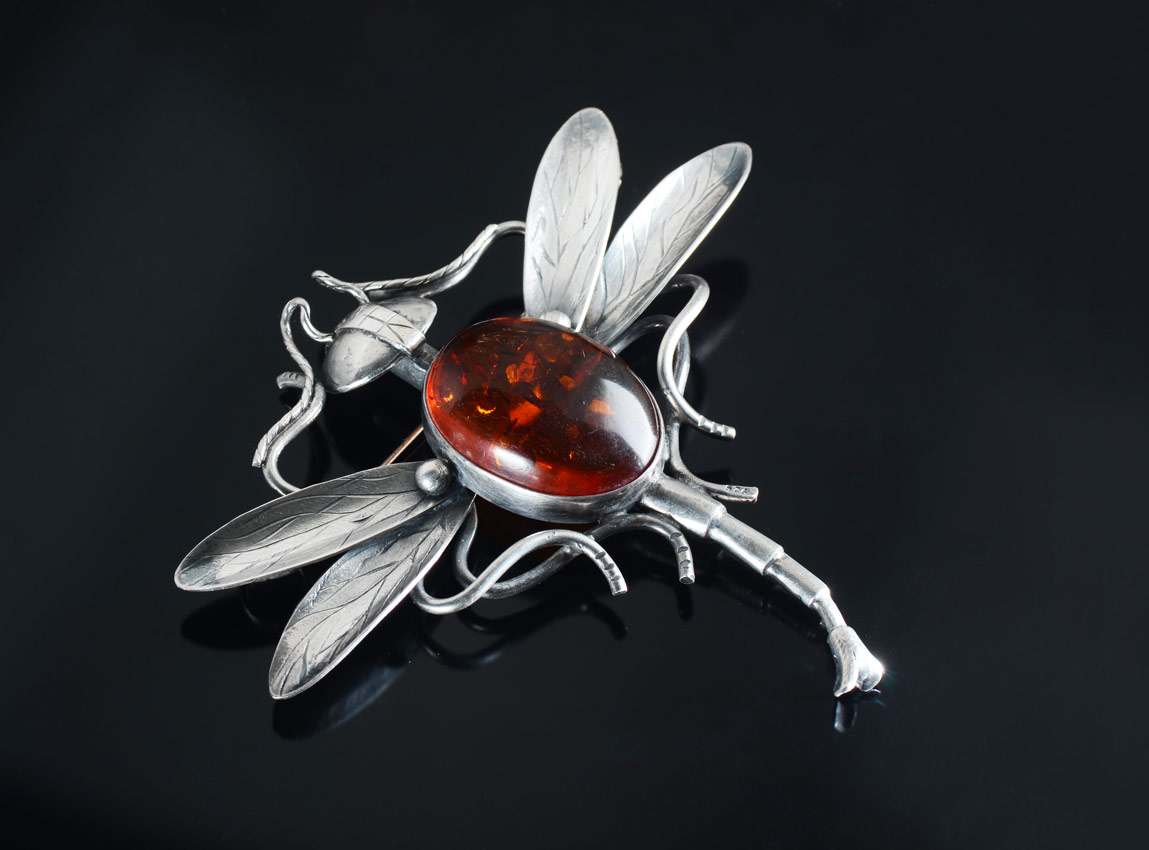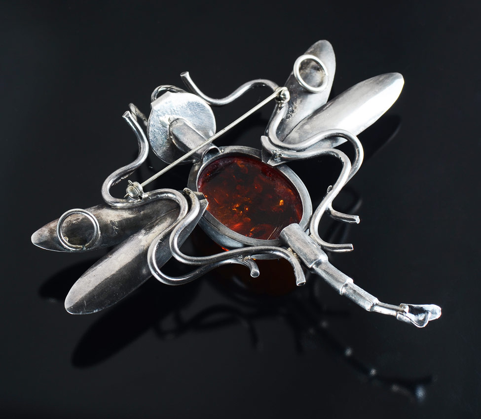 STERLING AND AMBER DRAGONFLY PIN / PENDANT: Wing span of 4''.