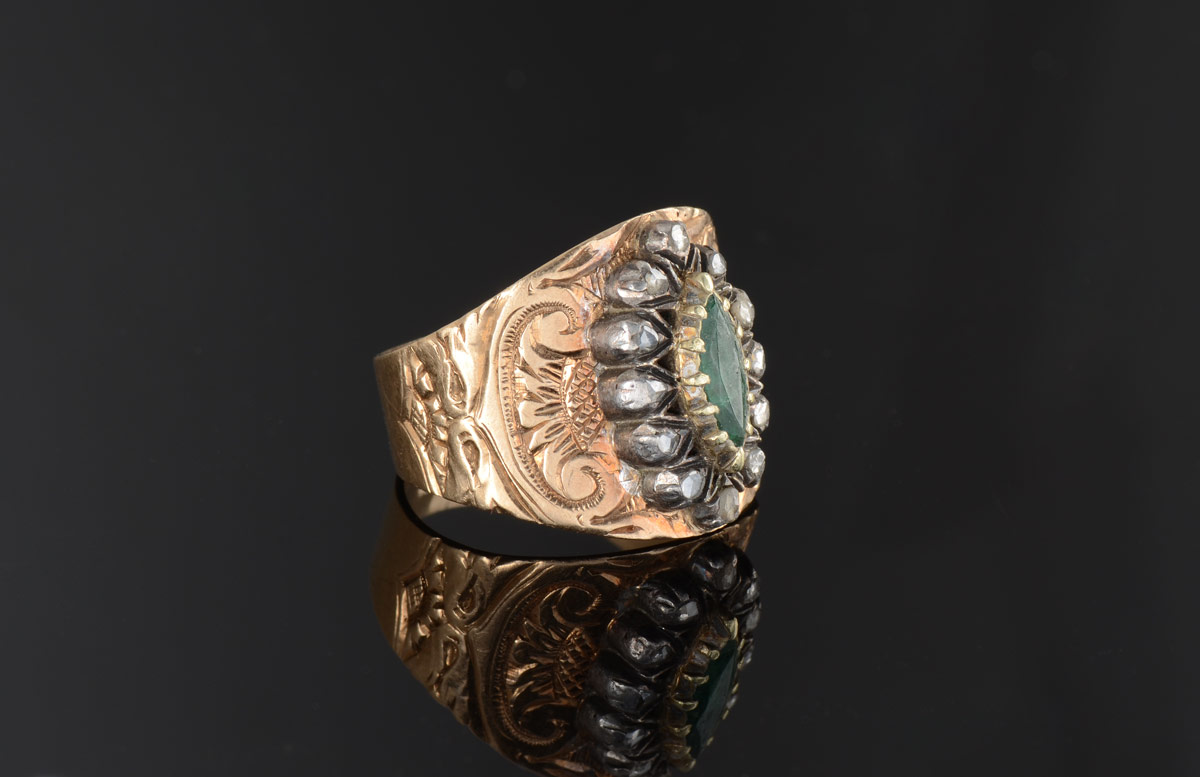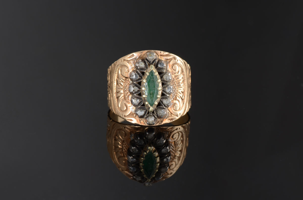AN ANTIQUE ENGRAVED EMERALD RING: 18K yellow gold ring centers one marquise cut emerald, .75 Ct. The stone is cracked. Framed by 12 irregular shaped rose cut diamonds. The diamonds are set in sterling silver. Weight: .15 Ct. Approx. 7.7 grams. Size: 8