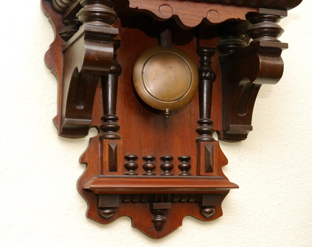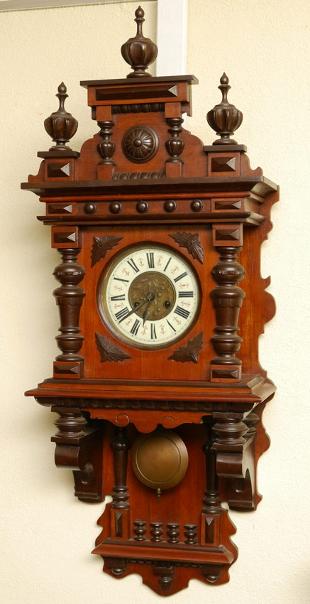 GERMAN CARVED WALL CLOCK: Removable architectural crest with 3 finials. Case with applied carved decoration. Dial with embossed floral center, porcelain ring with Roman numerals. Key wind time and strike movement marked with crossed arrows, brass pendulum. Overall 42'' h. x 16 3/4'' x 7 3/4''.