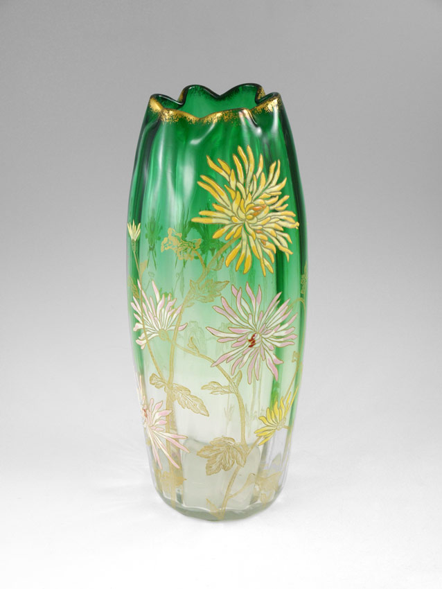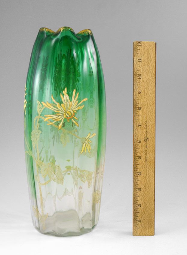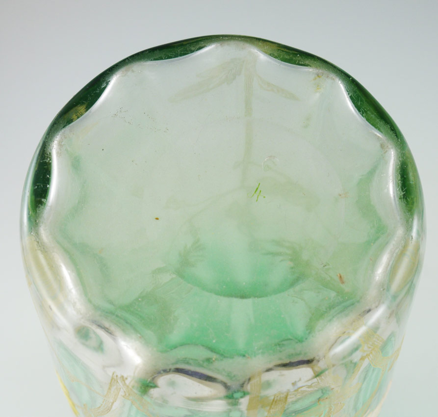 ENAMELED GLASS VASE: In the manner of Moser or Mont Joye, green graduating to clear at base. Floral decoration, marked on base with an H. 3'' h. x 5''.