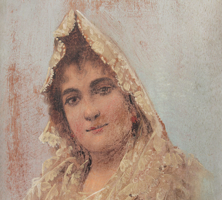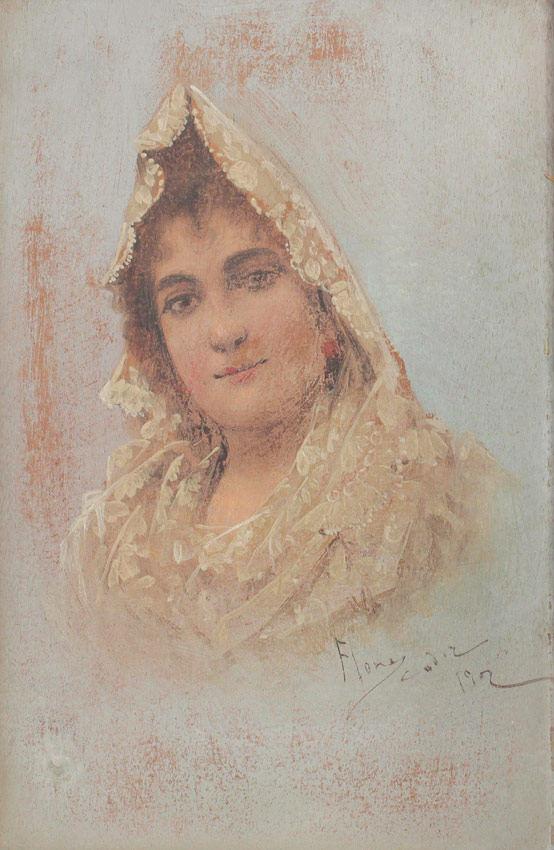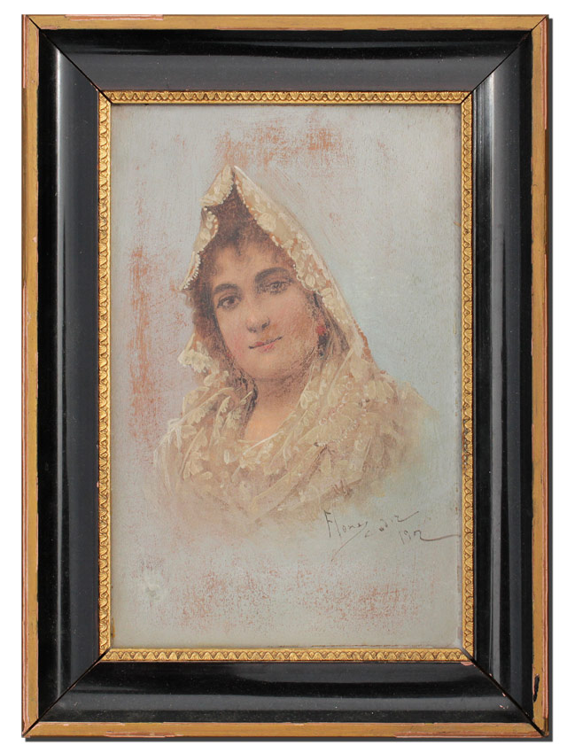 ILLEGIBLY SIGNED GIRL PORTRAIT OIL/BOARD: 9 1/2'' x 6 3/8'', signed lower right Flores? Cadir, dated 1902, worn period frame in need of reinforcing, 12 1/4'' x 9''.