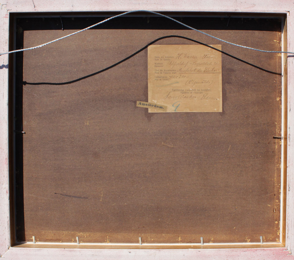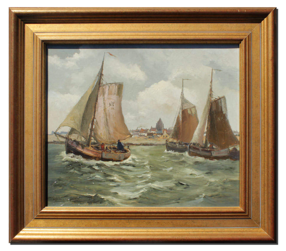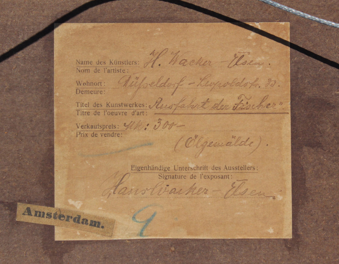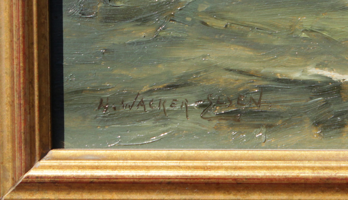 WACKER-ELSEN, Hans, (German, 1868-1958): ''Ausfahrt der Fischer'', Fishing Boats with Village in the Distance, Oil/Panel, 13 1/4'' x 15 3/4'', signed lower left, labeled verso, fine contemporary framing 19 1/4'' x 21 5/8''.