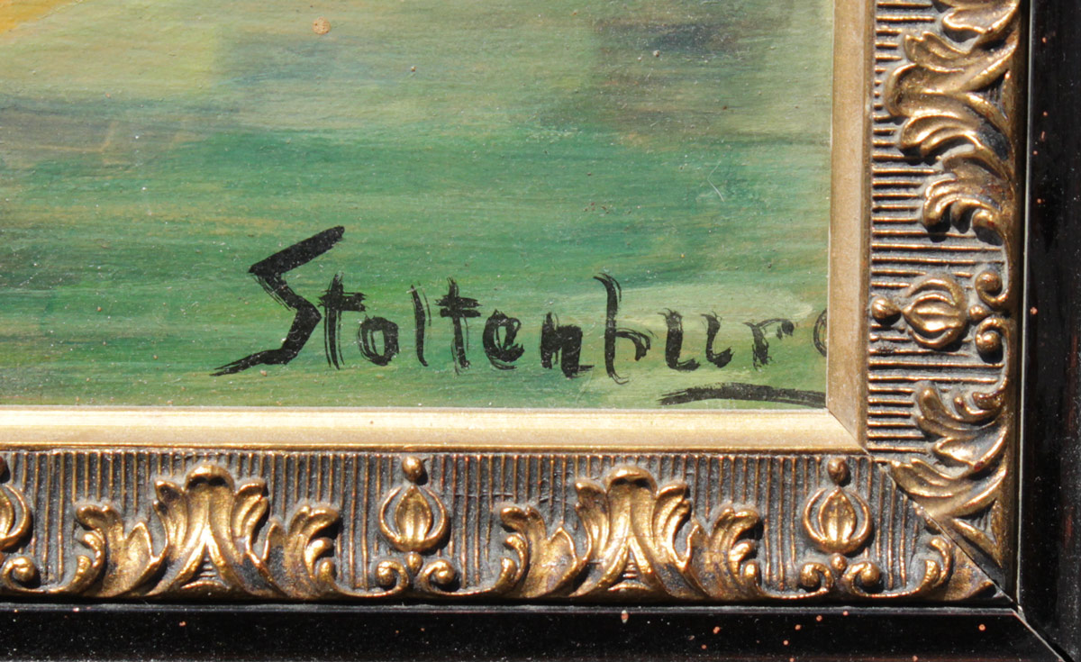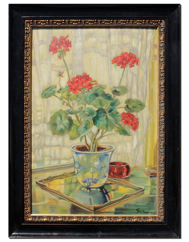STOLTENBERG, Fritz, (German, 1855-1921): Red Potted Flower in an Oriental Vase, Oil/Board, 26 1/2'' x 18'', signed lower right, painted frame 31 1/2'' x 23 1/4''. From the Collection of Professor Robert Bailey.