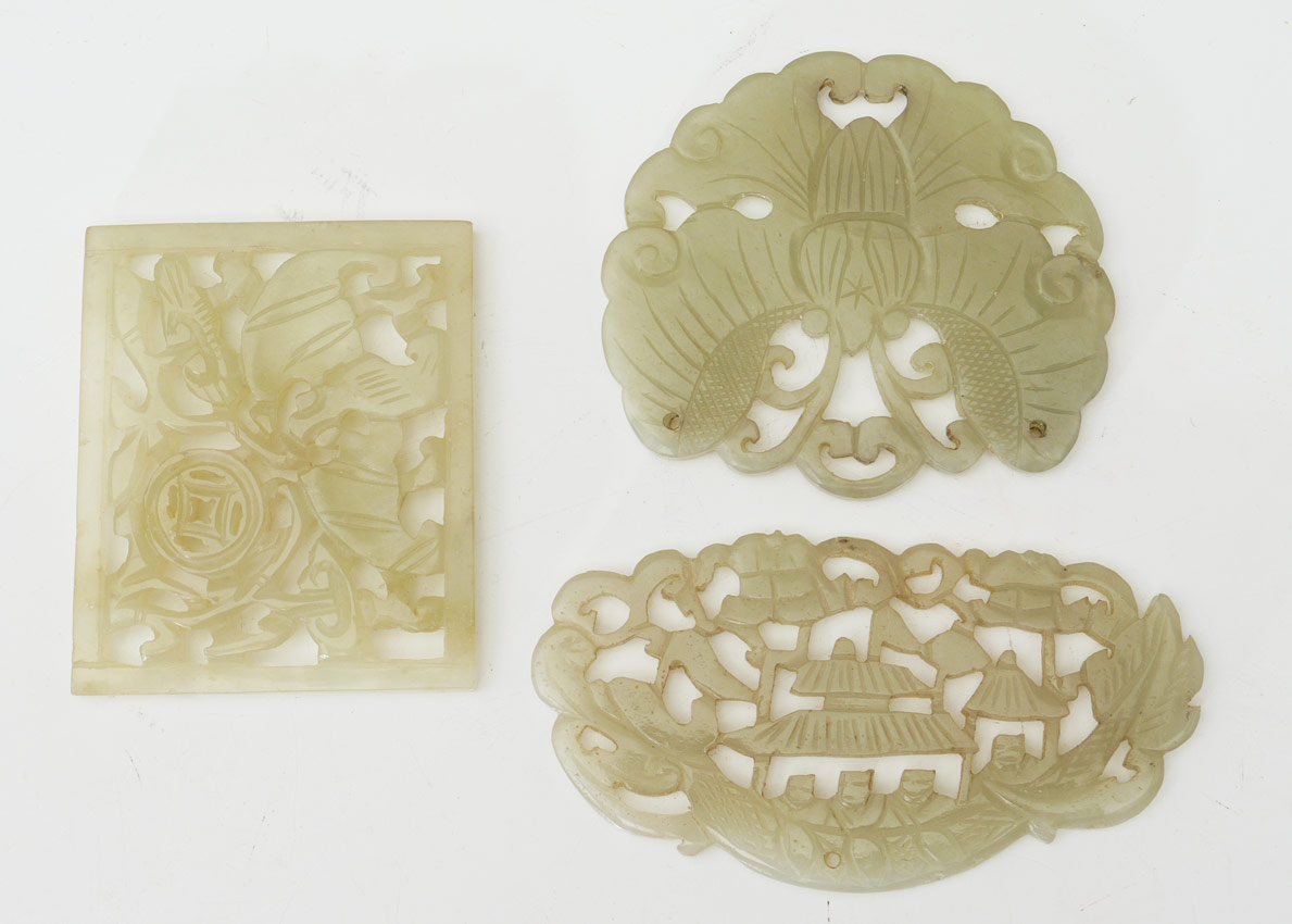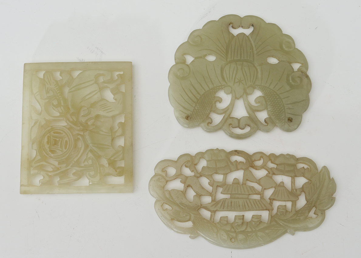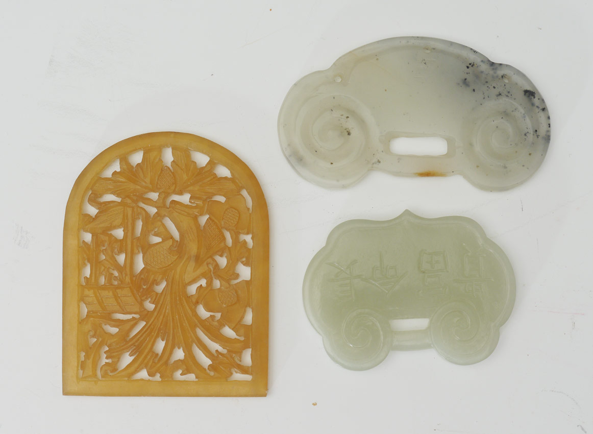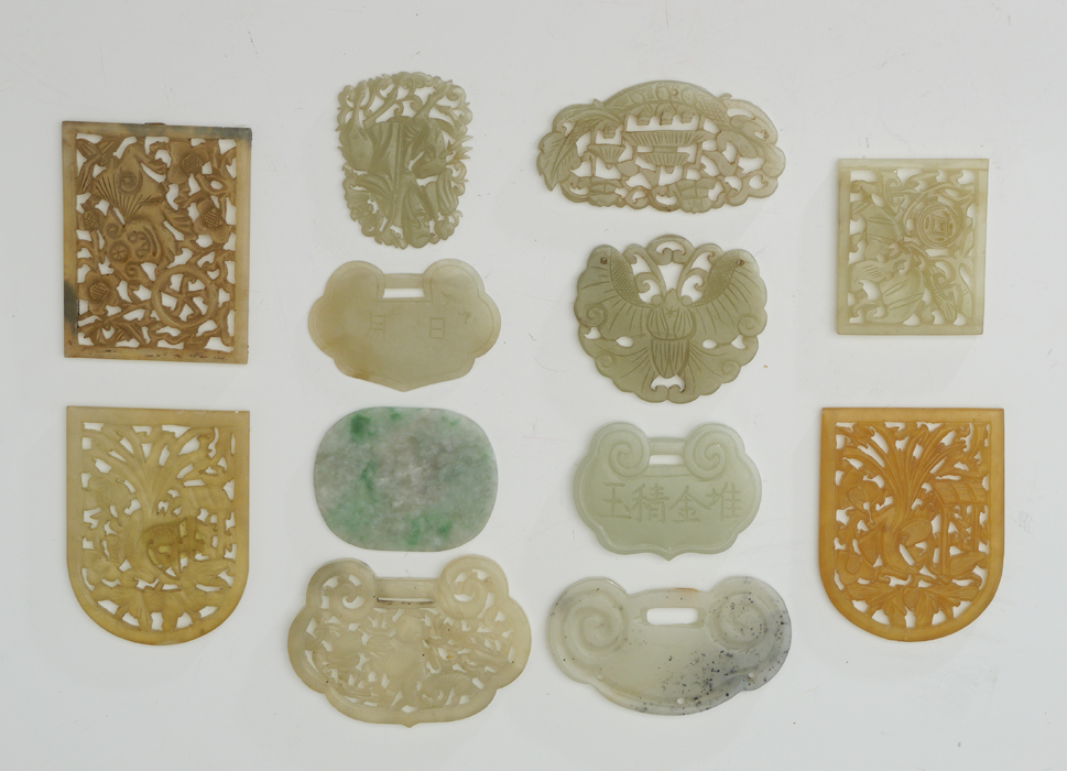 12 CHINESE CARVED STONE PLAQUES & BUCKLES: 12 assorted plaques and buckles, assorted stone to include possible jade, jadeite or serpentine. Largest plaque measures 3'' x 2 3/8''.