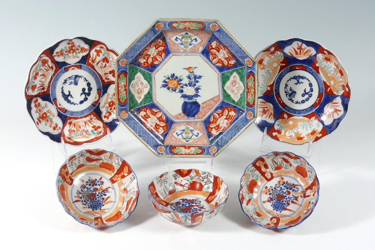 6 PIECE IMARI BOWLS: To include 3 bowls (2 1/2'' x 6 1/4''), 2 low bowls 1 1/2'' x 8 1/2''), signed octagonal bowl (11'').