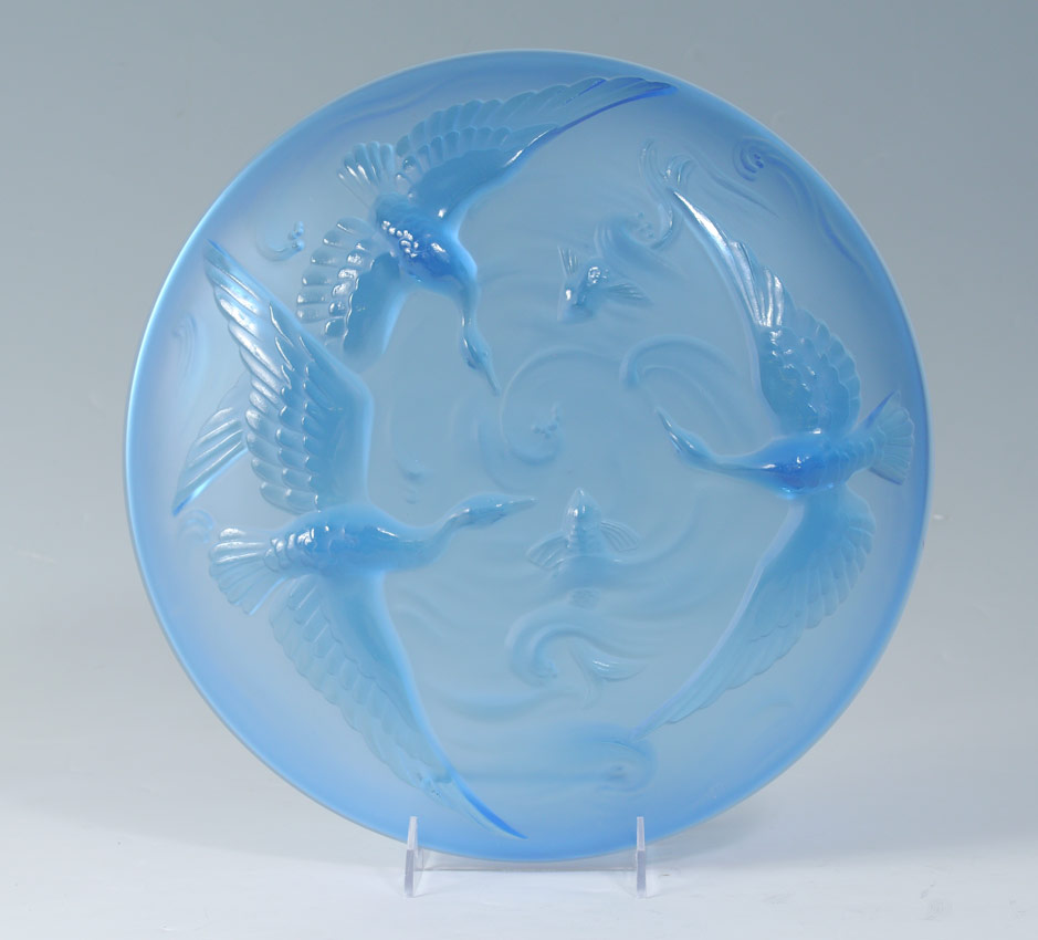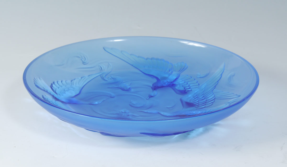 VERLYS GLASS DIRECTOIRE BLUE WILD DUCK BOWL: 13 1/2'' dia.