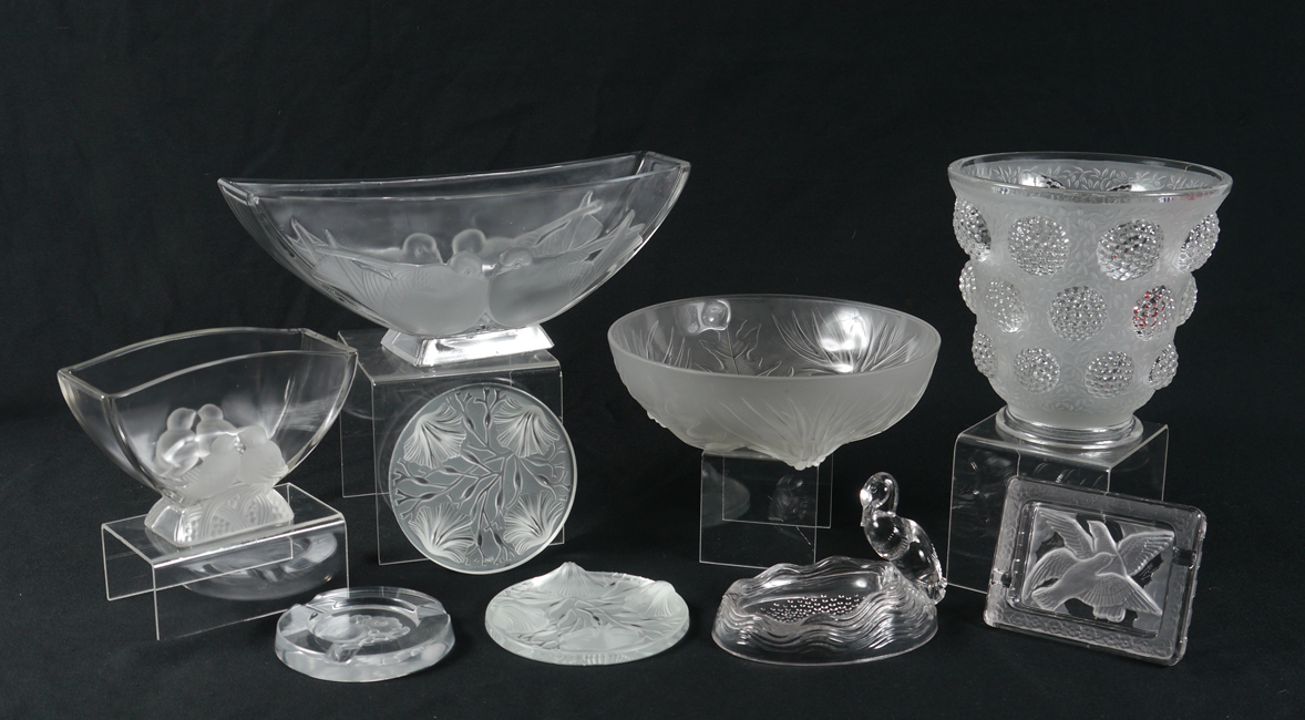 8 PIECE GROUP VERLYS GLASS: To include 1) Gem vase, 6 1/4''. 2) Pigeon vase, 12''L., 3) Love Birds vase, 6 3/4''. 4) Thistle bowl, 8 1/2'' dia. 5) Swallow ash tray. 6) Duck tray, 4'' tall x 5 1/2''. 7-8) Two round trivets or paper weights.