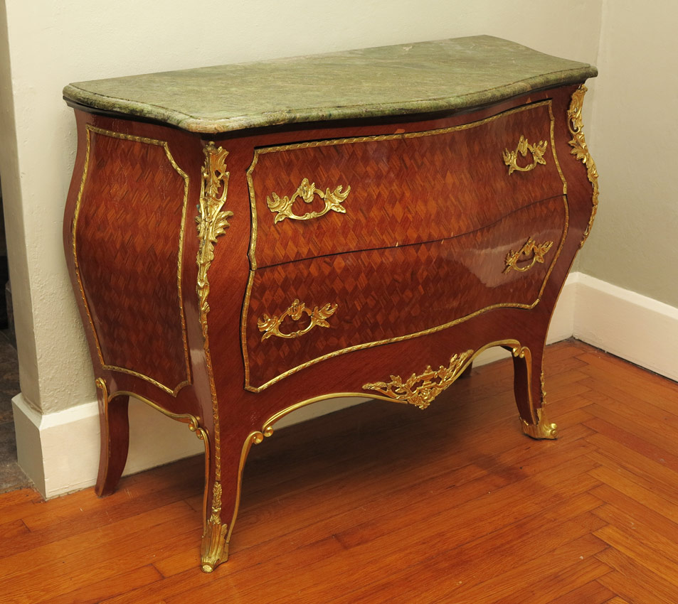 FRENCH STYLE MARBLE TOP ORMOLU BOMBE CHEST: Green variegated marble top. Bombe base with 2 diamond pattern inlaid drawers, ormolu mounts. Measures 35 1/2'' h. x 45'' x 19 1/2''.