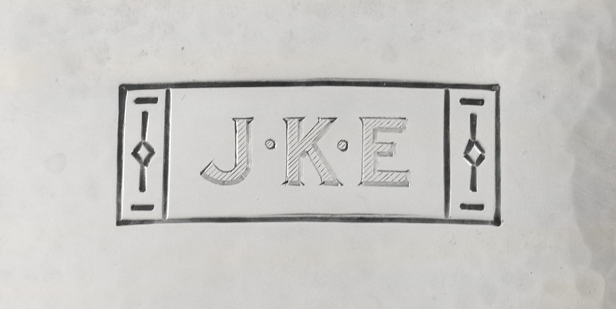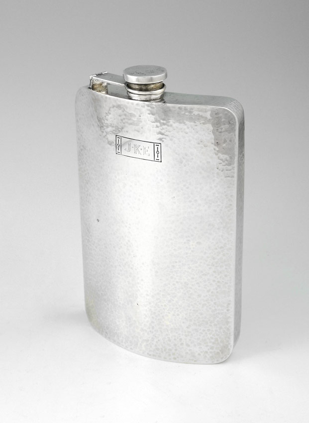 HAND HAMMERED INTERNATIONAL SILVER STERLING FLASK: 3/4 pint flask, hand hammered body with screw top, monogrammed JKE. 7 1/2'' h. x 4 1/2''. Approx. 8.7 troy oz.