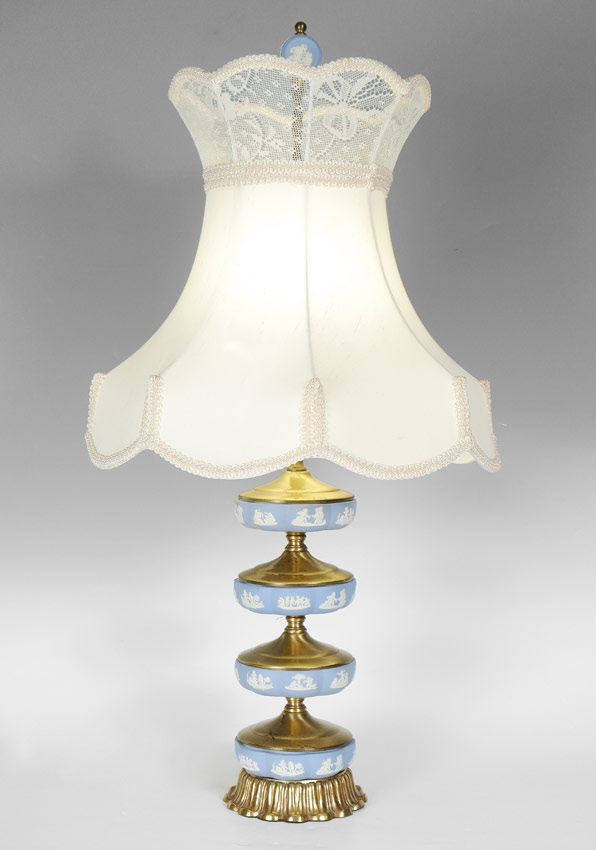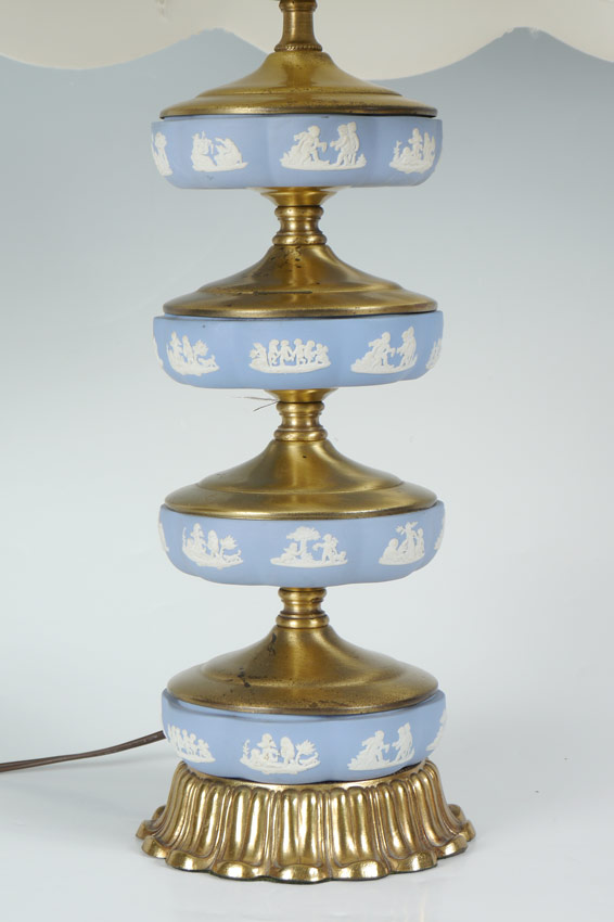 TIERED BRASS & WEDGWOOD LAMP: Brass base with 4 tiers of blue jasperware Wedgwood and brass. 17'' h. to top of socket, 31 1/4'' h. to top of Wedgwood finial x 6'' base dia. Sold with cloth shade 15 1/2'' h. x 16 1/4''.