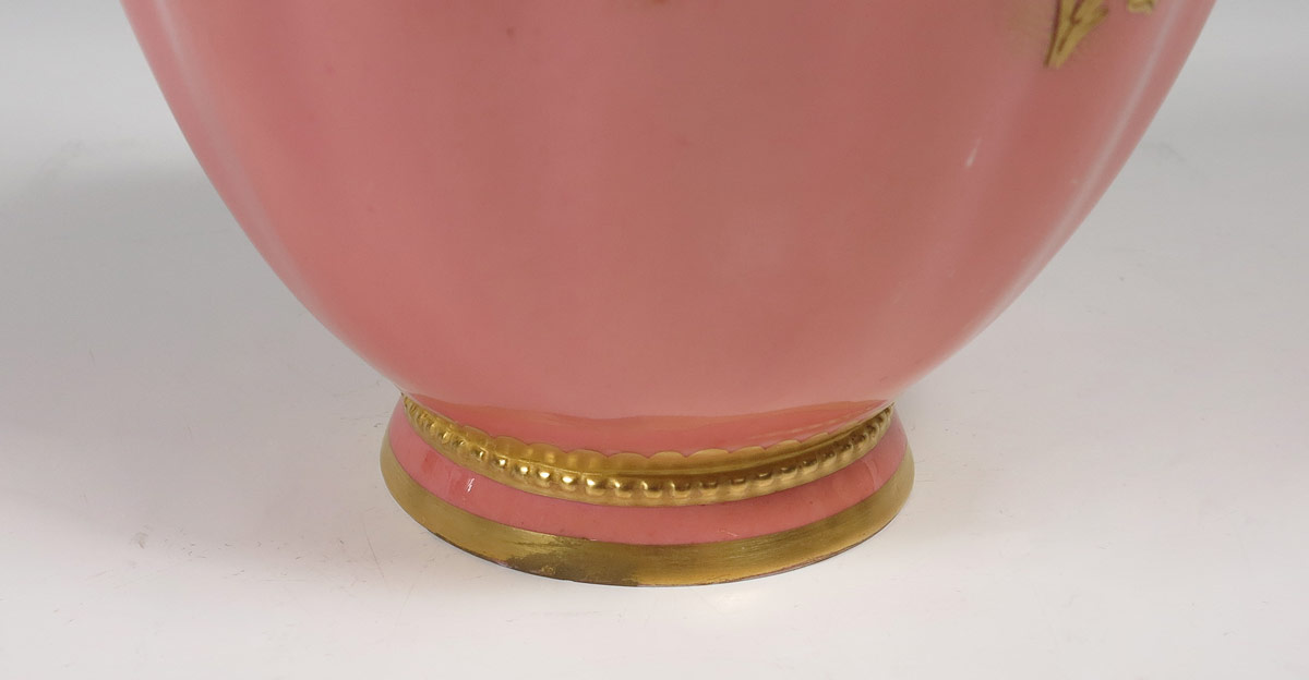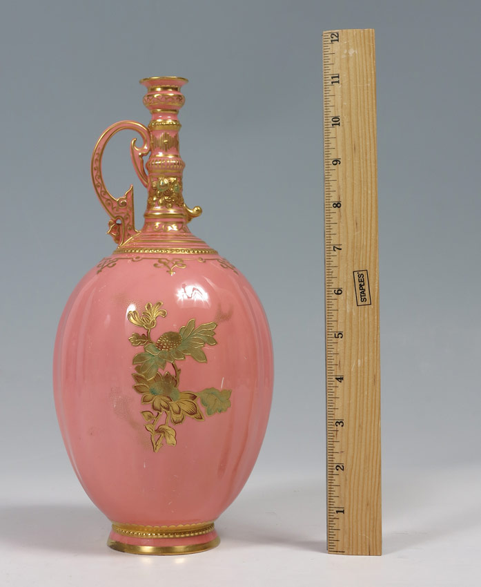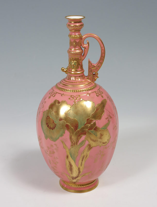 ROYAL CROWN DERBY PORCELAIN EWER: Gilded iris design on slightly ribbed porcelain body. Measures approx. 11'' tall.