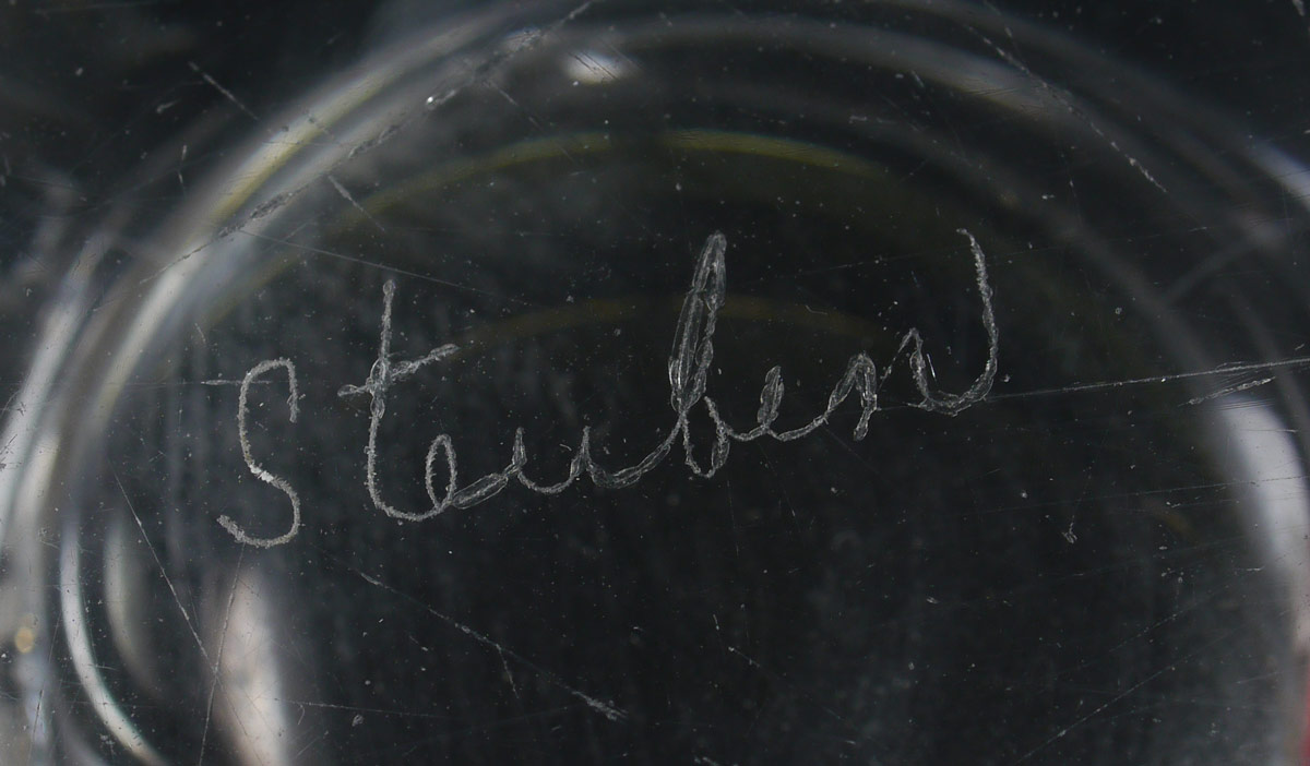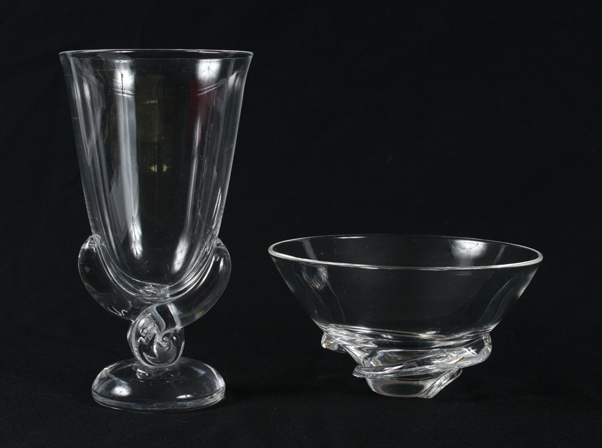STEUBEN CRYSTAL VASE AND BOWL: Colorless crystal. Vase measures 8.5'' tall. The bowl 3.5''h. x 7'' dia.
