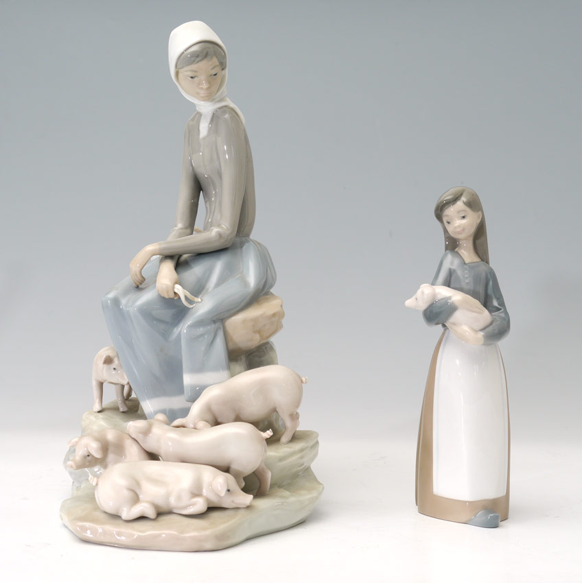 2 LLADRO PORCELAIN FIGURINES: By sculptor Fulgencio Garcia. ''Girl with Piglets'' #4572, issued 1969 retired 1985, 10 1/2''h. And ''Girl with Pig'' #1011, issued 1969 retired 2001, 6 3/4''h. Sold as a lot.