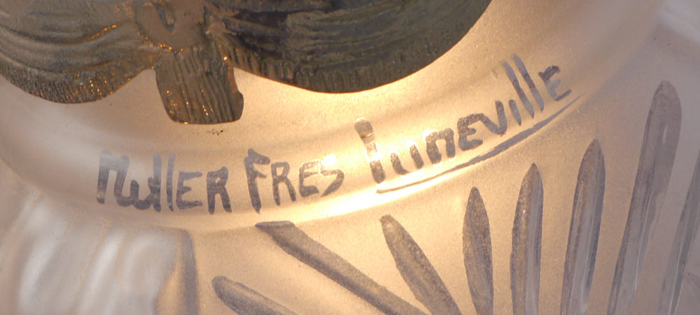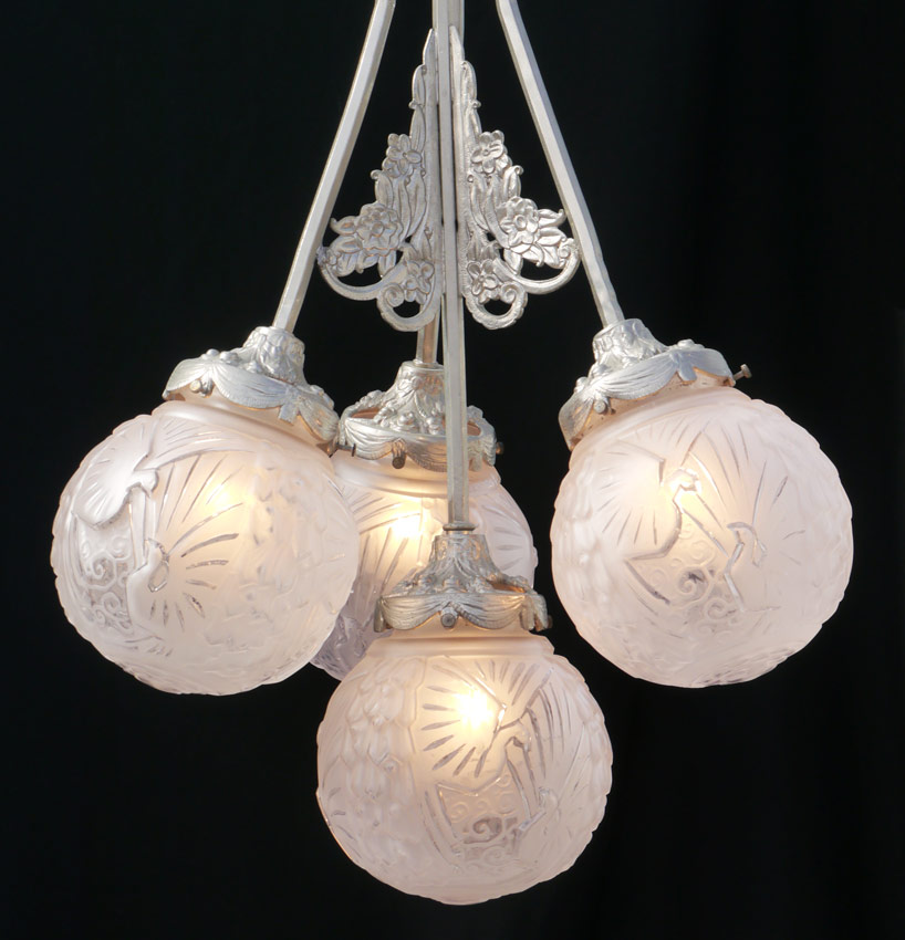MULLER FRERES ART DECO CEILING LIGHT FIXTURE: Luneville, France. Four signed satin glass globular shades. Fixture 29 3/4'' h. x 15'' x 12'', globes 6'' dia.