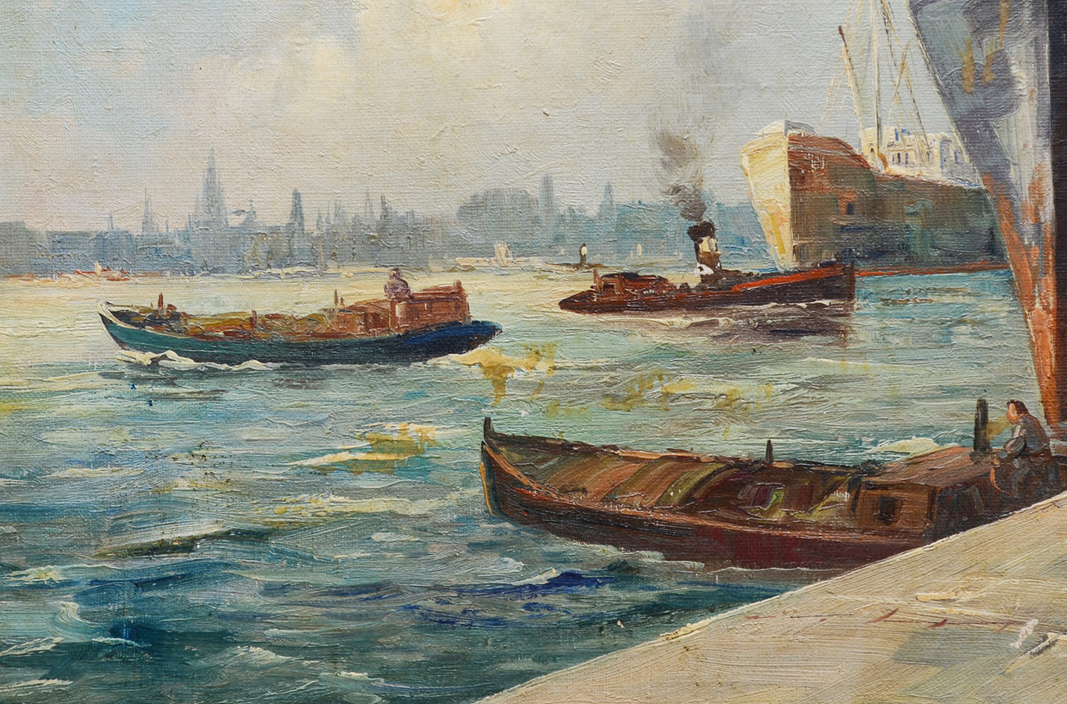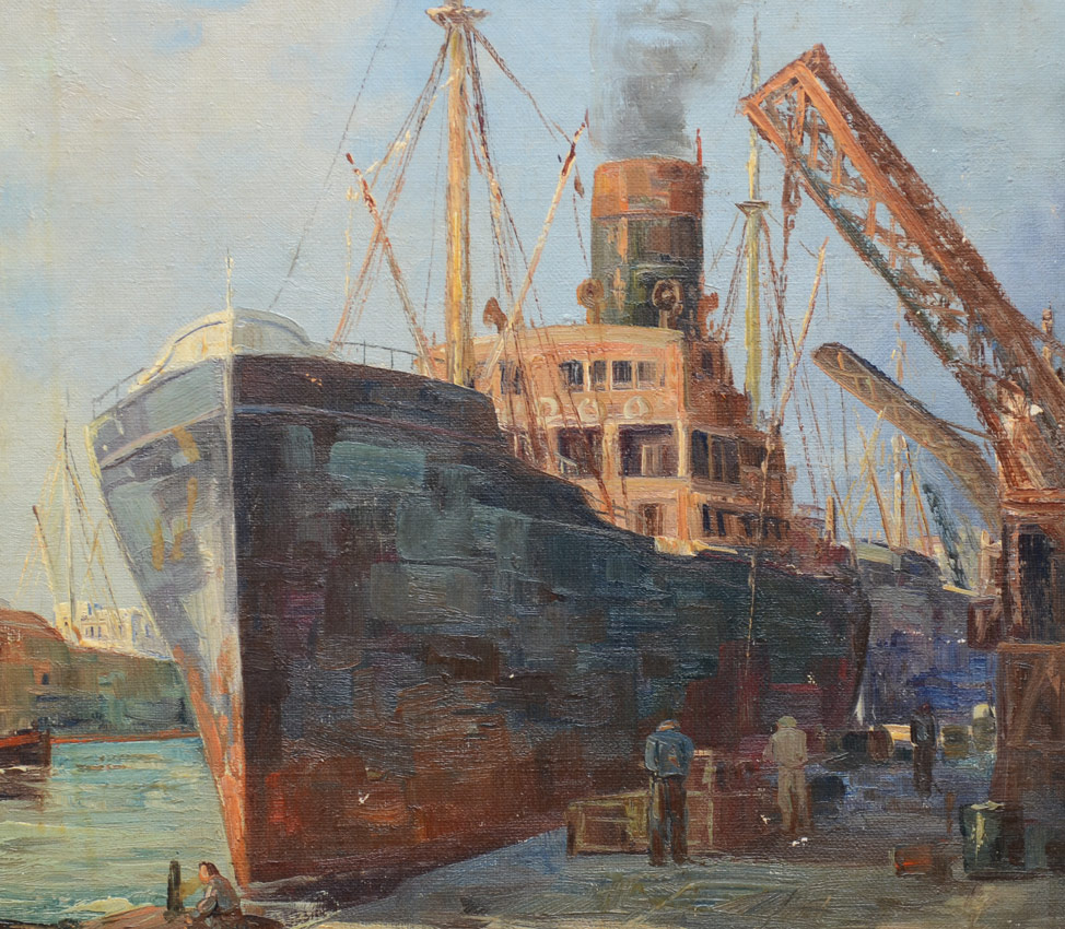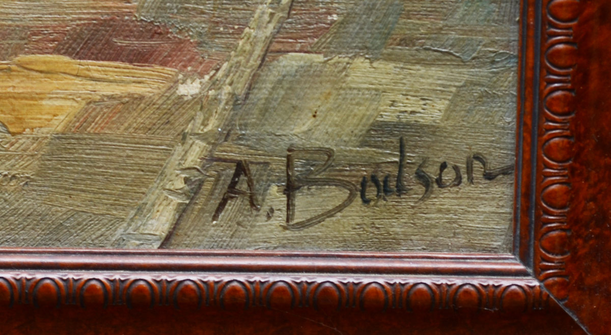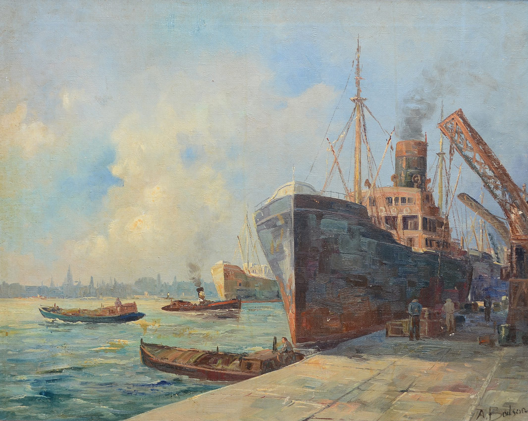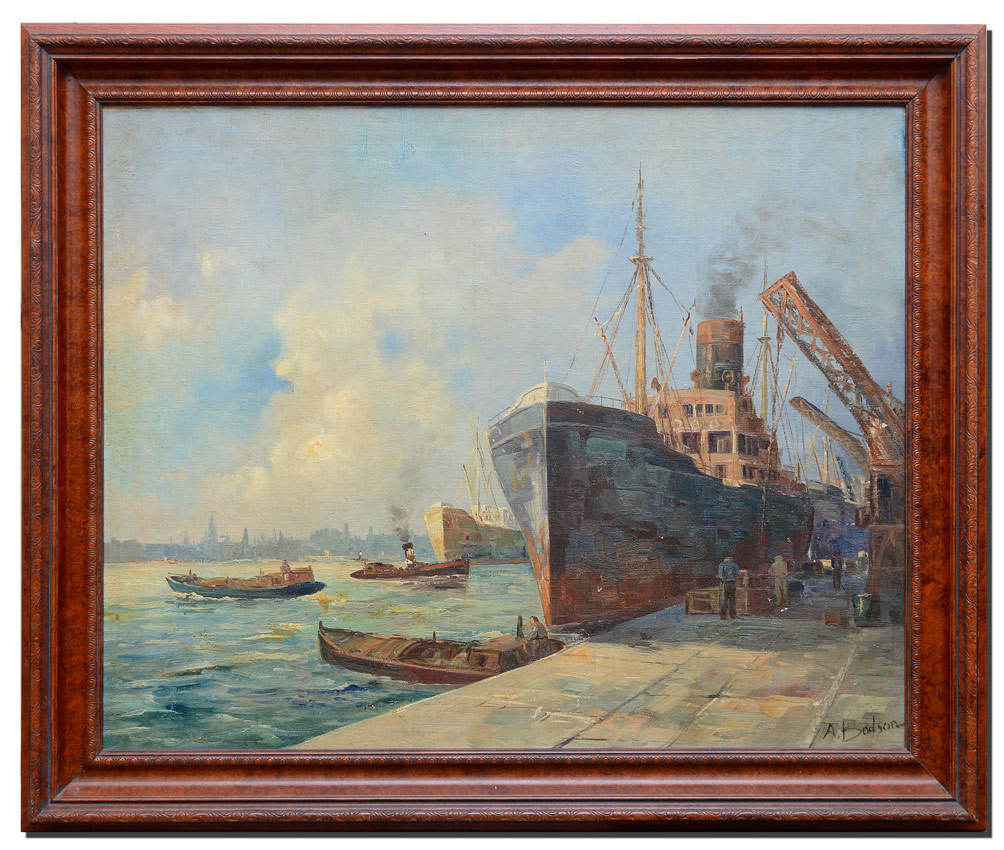 URBAN HARBOR DOCKSIDE PAINTING: Oil/Canvas, 23 3/4 x 30'', signed lower right, A. Bodson, faux wood grain frame with wear, 29 1/2'' x 35 1/2''.